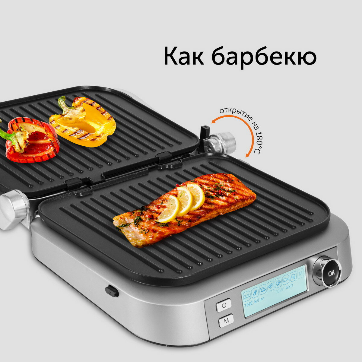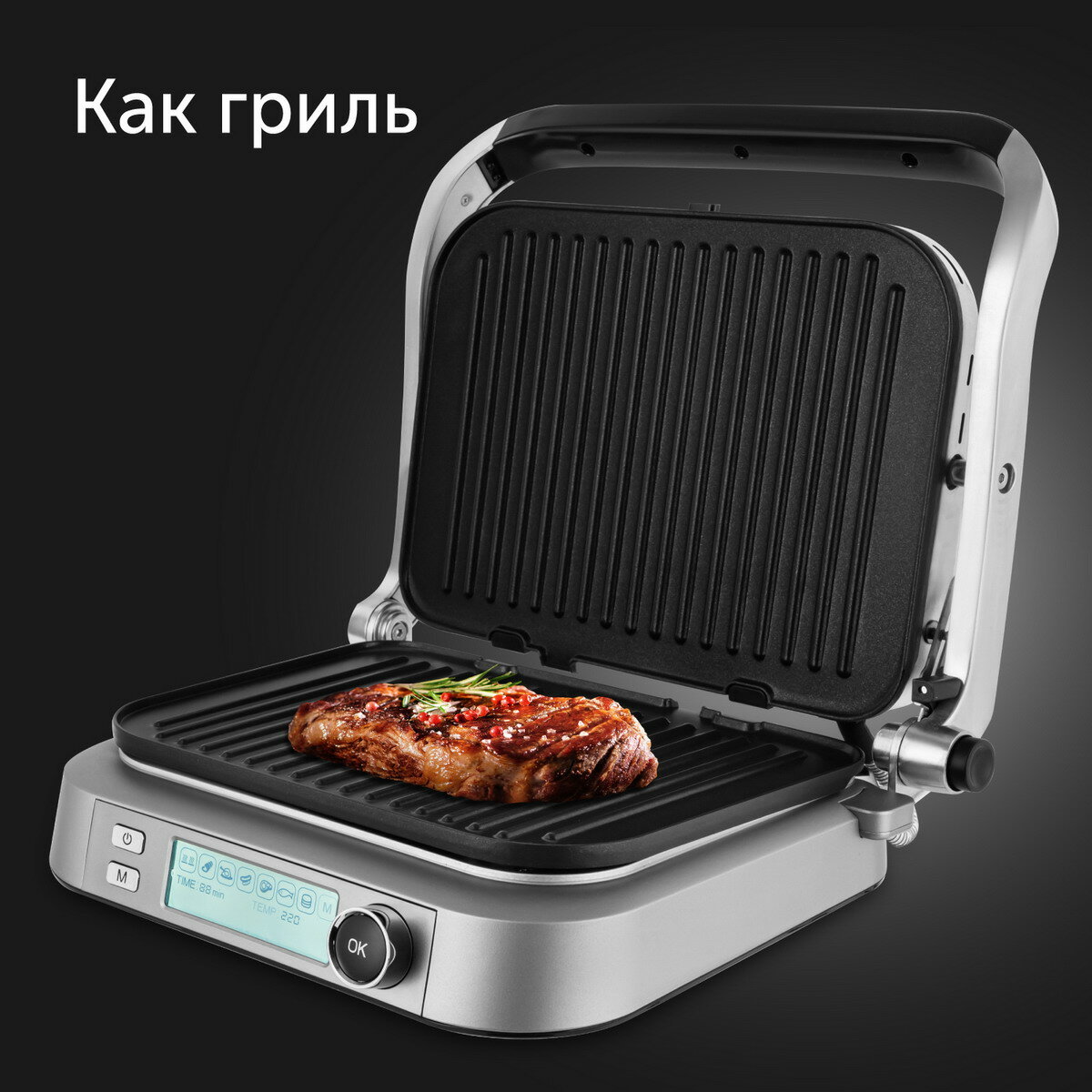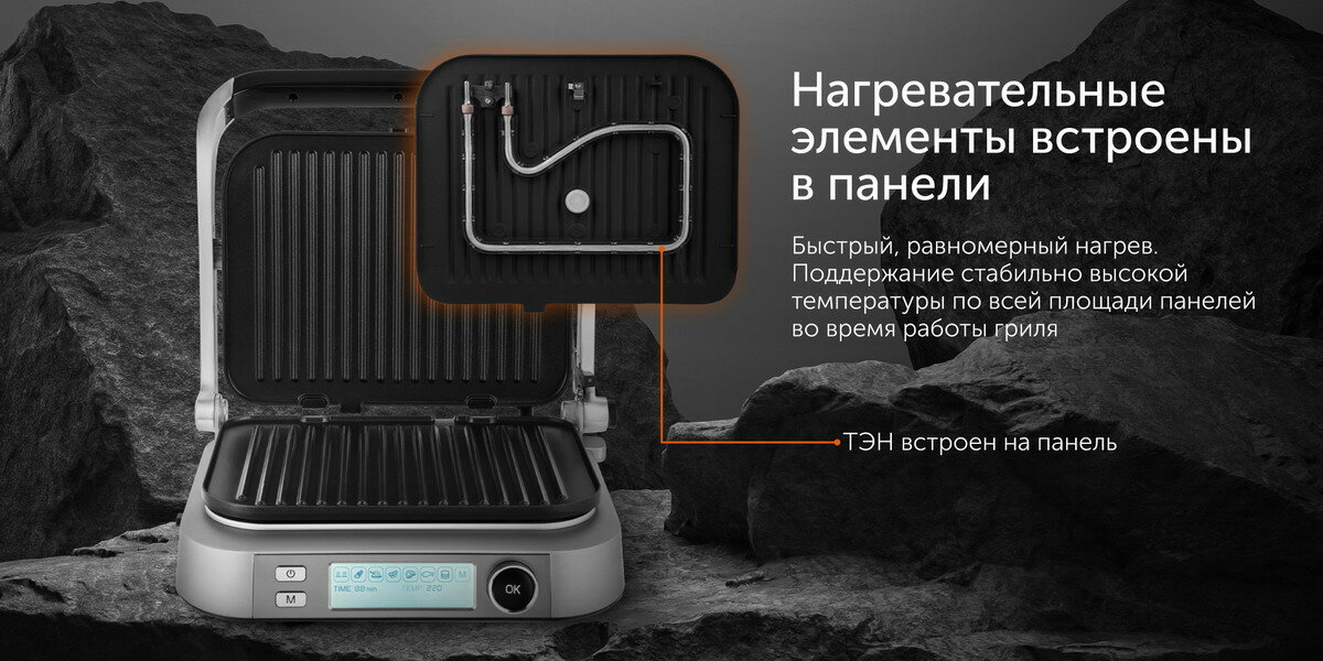 | Дополнительная информация | Фиксатор положения (замок для вертикального хранения), Автоматическое определение толщины стейка, Размер рабочей поверхности 280 × 210 мм |