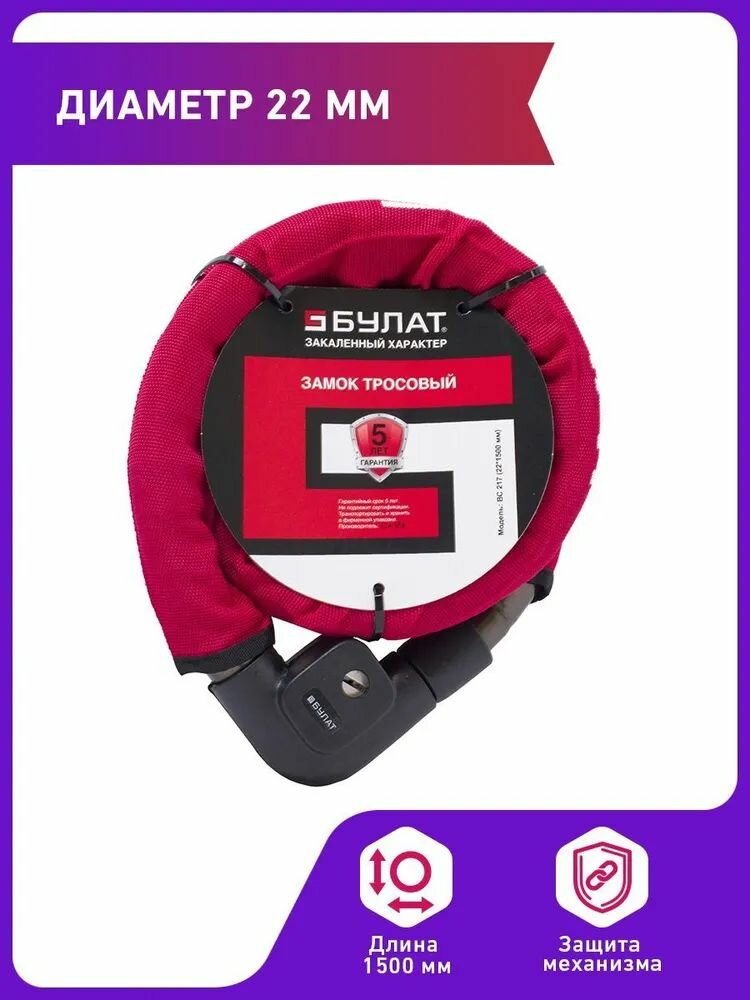 Купить Нтц-булат 13877 Замок тросовый булат красный d22мм 1500мм 3 ключа ВС217