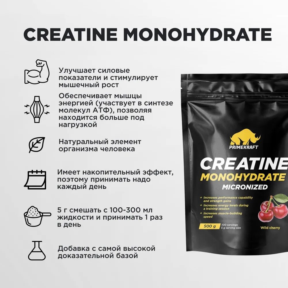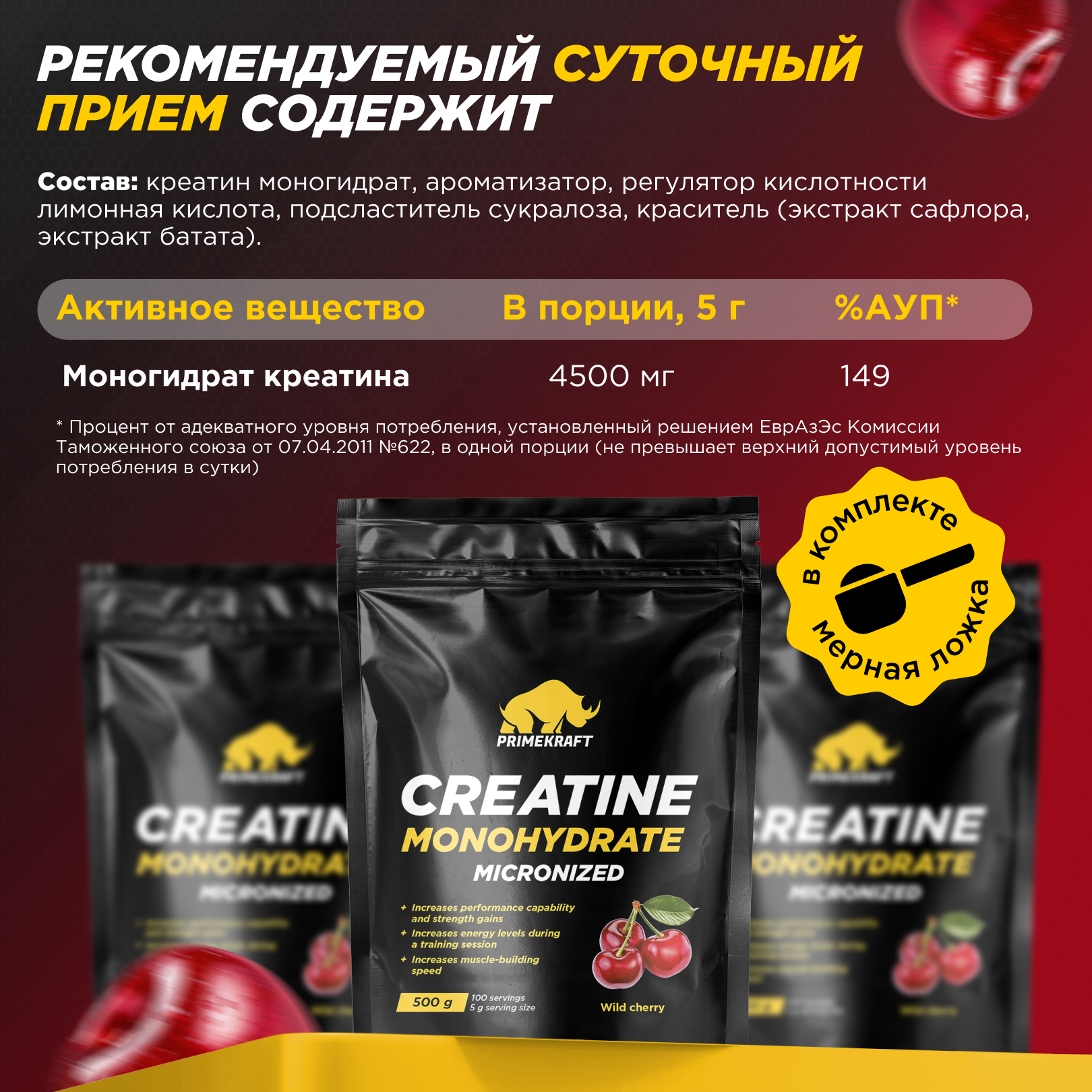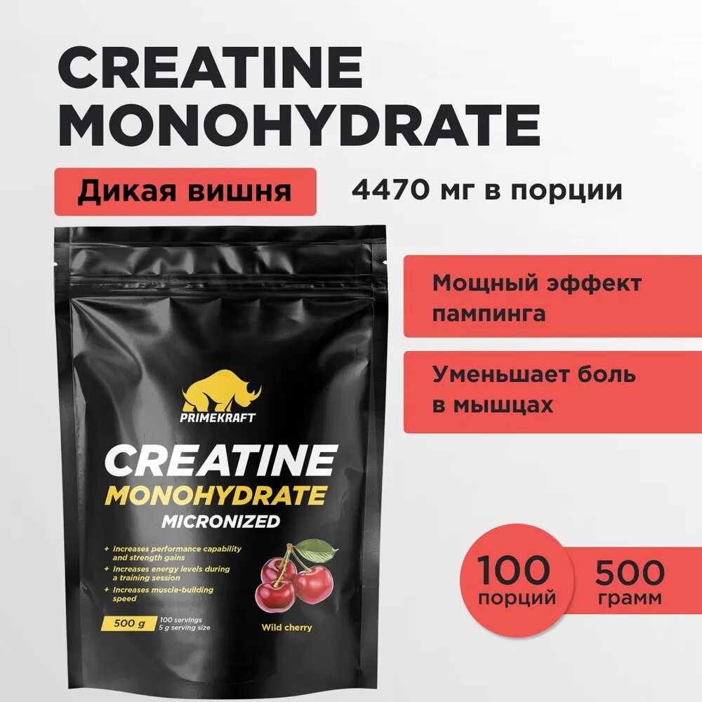 Креатин Моногидрат PRIMEKRAFT Creatine Monohydrate Micronized, со вкусом wild cherry (дикая вишня), 500 гр / 100 порций
