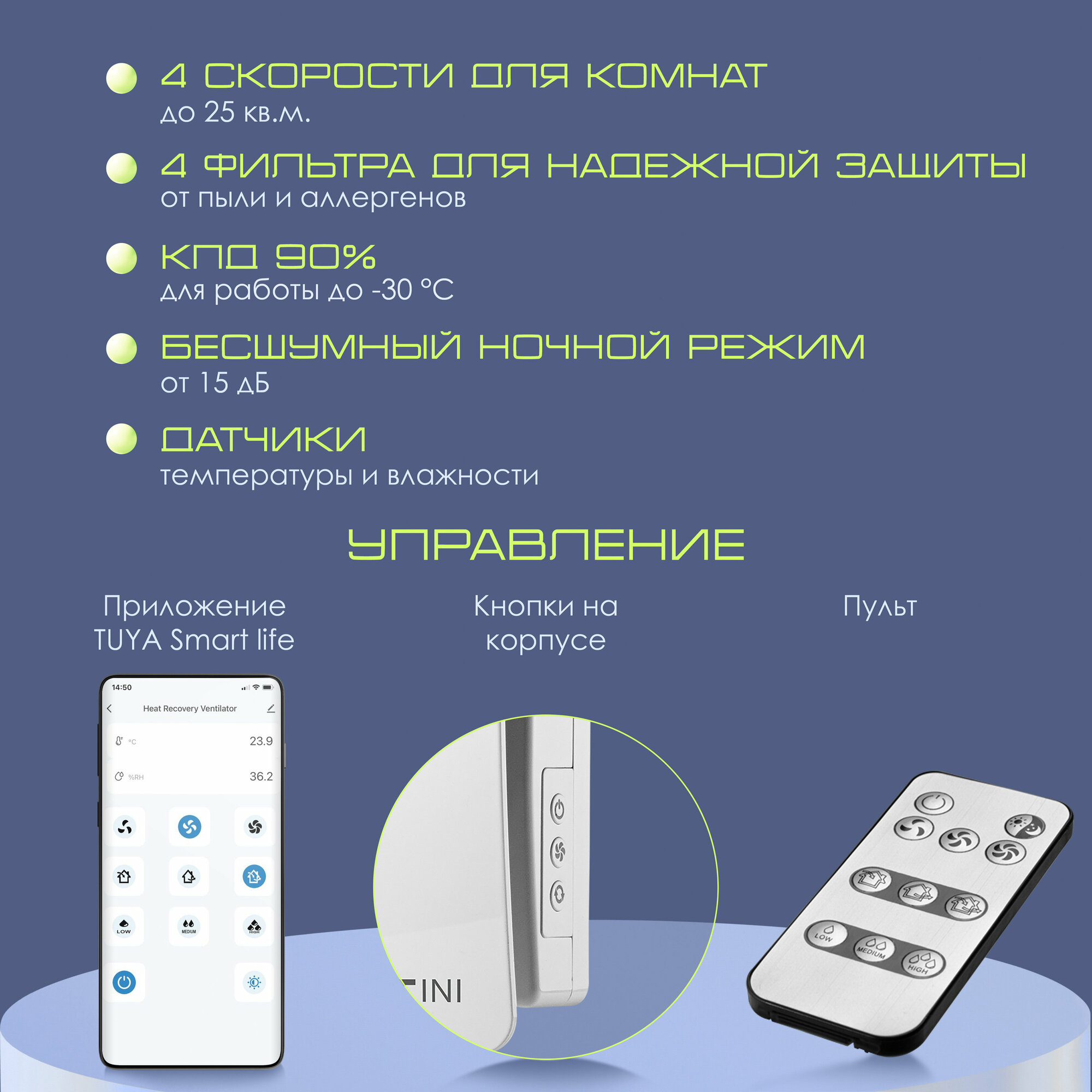 Рекуператор VENTINI HRV-60 (B) Wi-Fi, Скрытое подключение, от 15 дБ, 4 скорости, 4 функции.