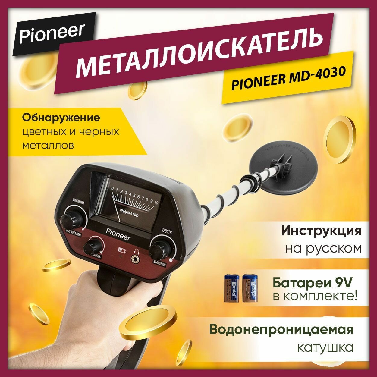 Купить Металлоискатель грунтовый Pioneer MD-4030 для поиска золота, монет, черных металлов, 2 режима, автобаланс грунта
