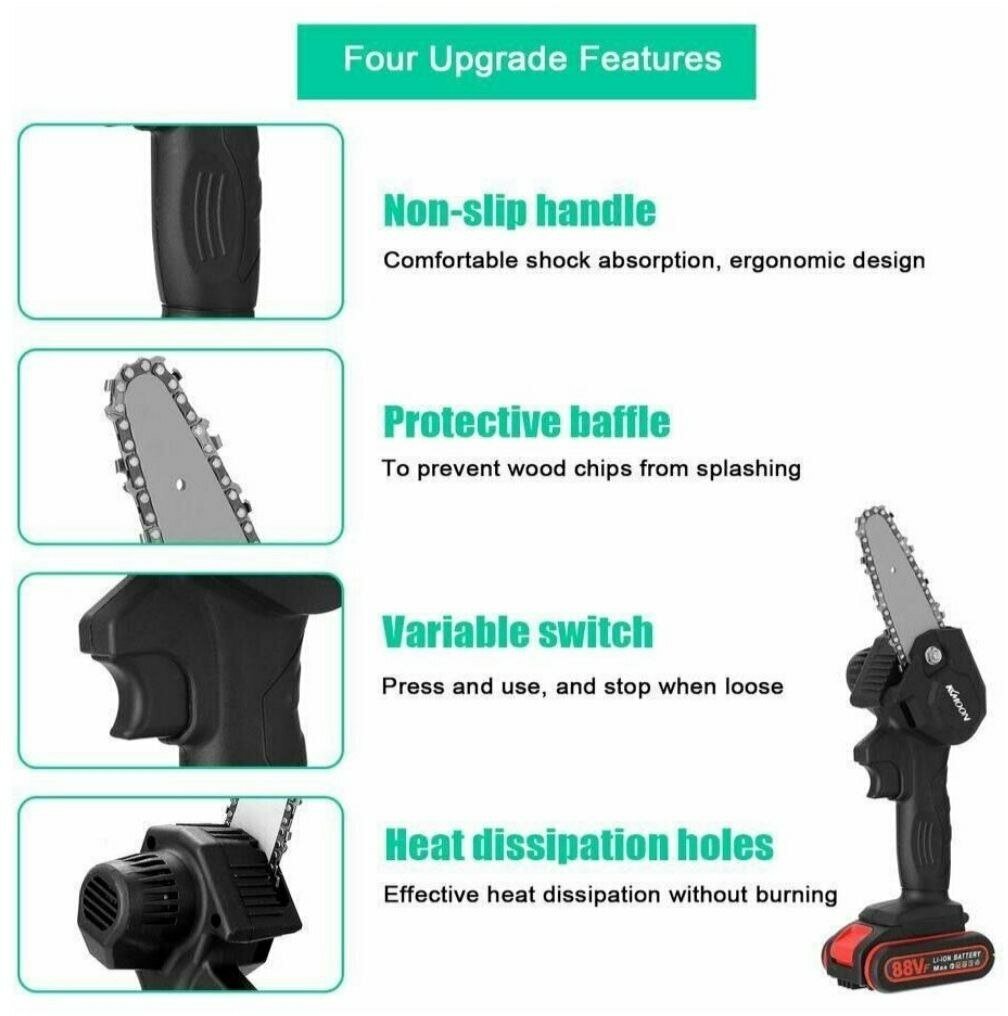 | Комплектация | 1 * Аккумуляторная цепная пила, 1 * Аккумуляторный секатор-сучкорез, 2 * Аккумулятор 21v, 1 * кабель питания, 1 * отвертка, 2 * S-leeve , 1 * Руководство |