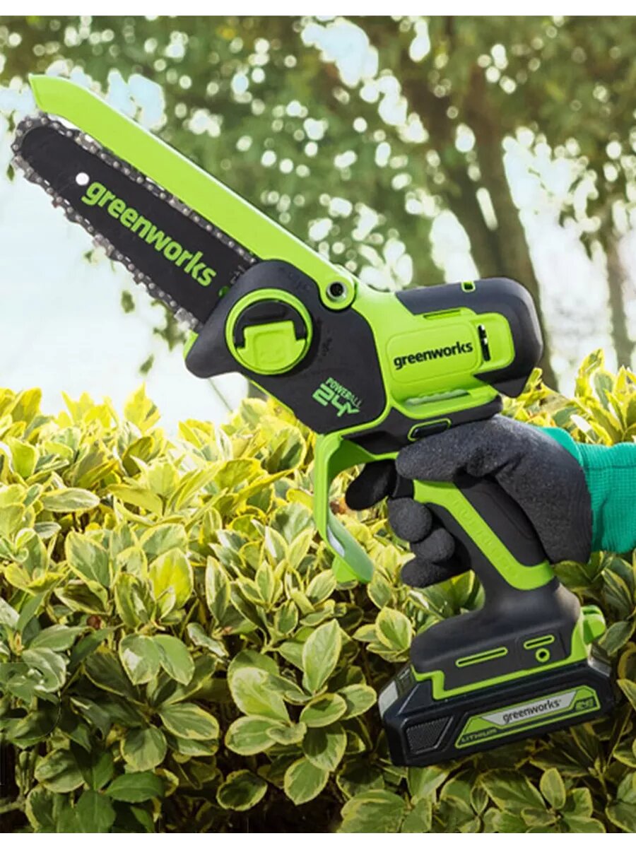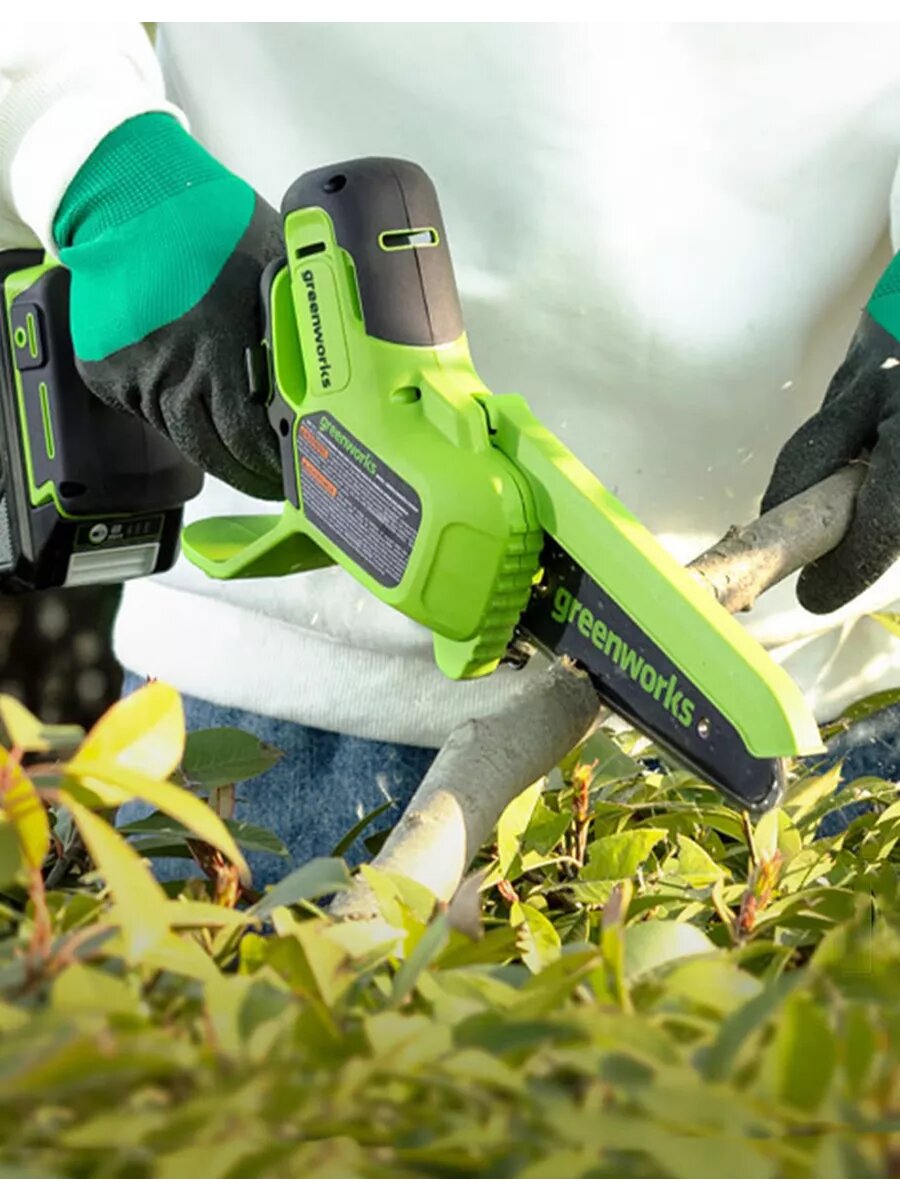 Цепная мини пила аккумуляторная Greenworks Арт. 2008707, 24V, 15см, бесщеточная, без АКБ и ЗУ