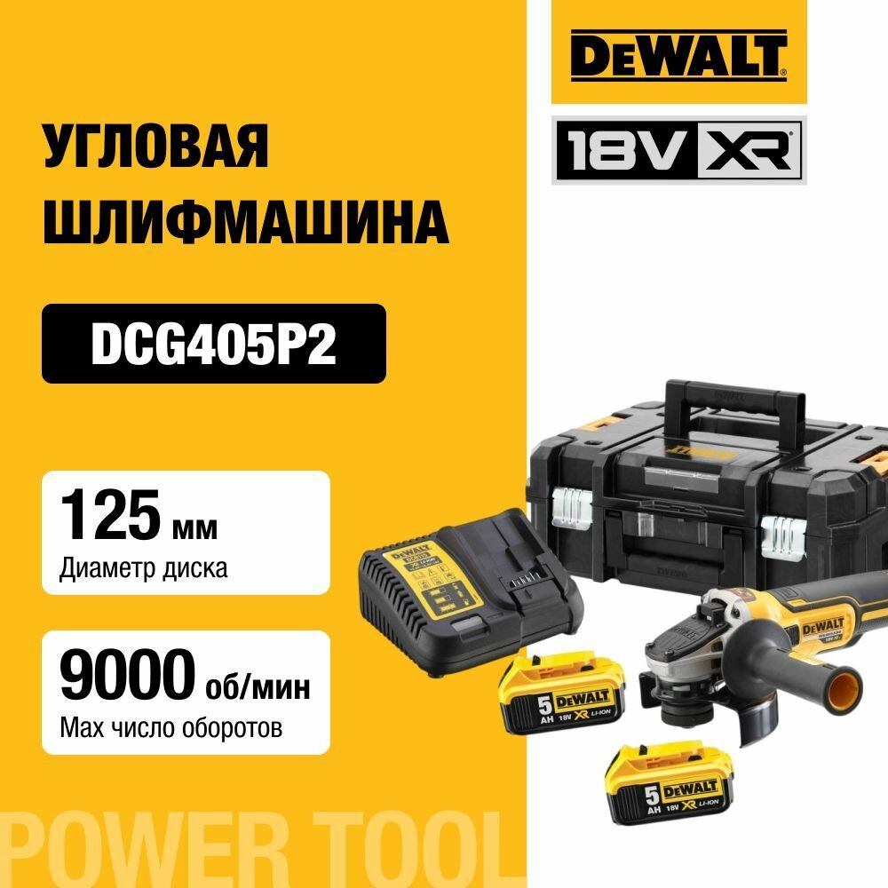 Купить Аккумуляторная бесщеточная угловая шлифмашина DeWALT, 18 В, 125 мм, 9000 об/мин, чемодан, с 2 АКБ 5 Ач и ЗУ, в кейсе TSTAK, DCG405P2
