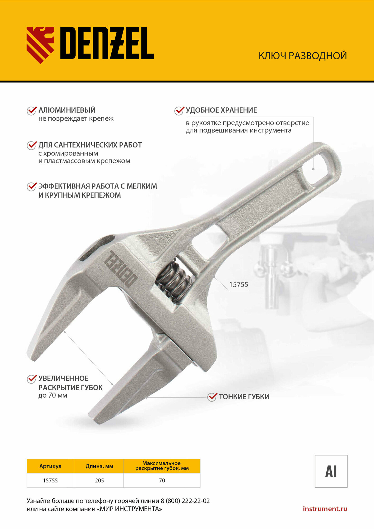 Ключ разводной 205 мм, алюминиевый Denzel [15755] интересное: