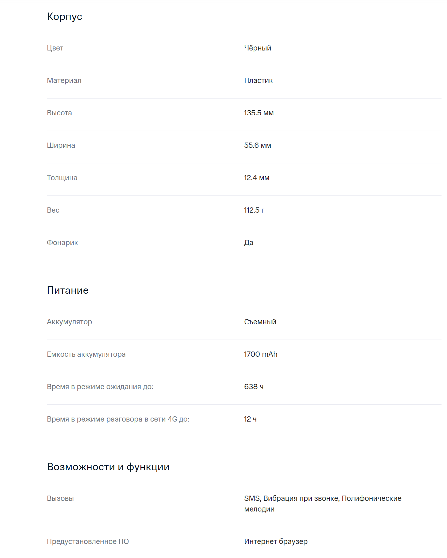| Плюсы: | Долго держит заряд, покупал как резервный телефон. |