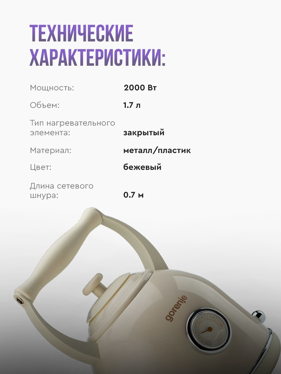 Чайник электрический Gorenje K17CLIN емкость 1.7 л, мощностью 2000 Вт, термостат Strix, кремовый