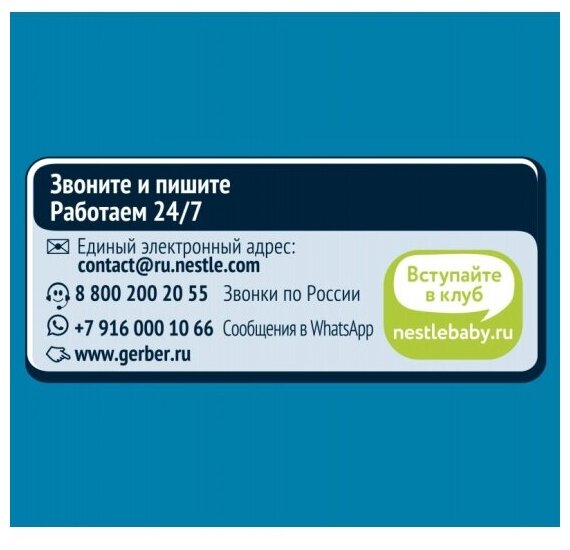 Каши Gerber имеют простую чистую рецептуру: никакого добавленного сахара; никакого пальмового масла; никаких искусственных красителей, ароматизаторов, и консервантов; никаких генетически модифицированных ингредиентов. Вскрытый пакет следует плотно закрыть. Открытую пачку с продуктом следует хранить в сухом прохладном месте не более двух недель.