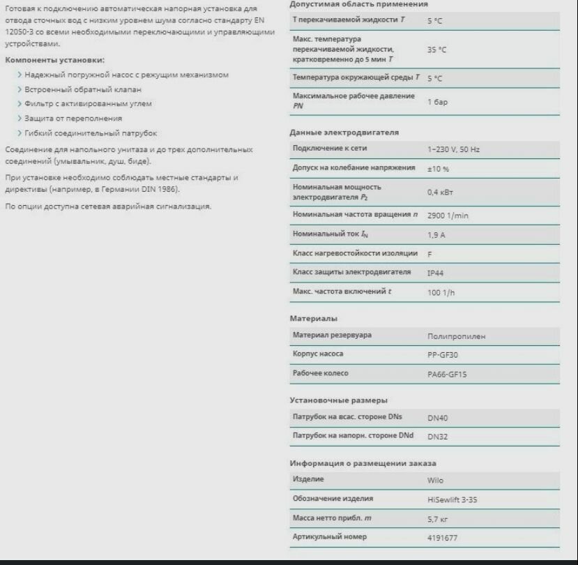 Канализационный насос Wilo HiSewlift 3-35 интересное: