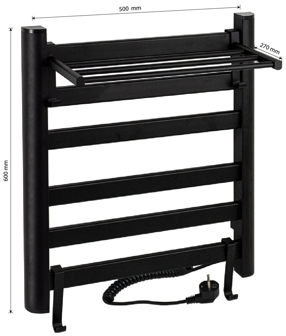 Полотенцесушитель электрический BRIMIX чёрный лесенка с полкой , 600 х 500 х 270 мм на 5 плоских перекладин, 160 W, из алюминия, тэн из углеродного волокна, код: 08091B