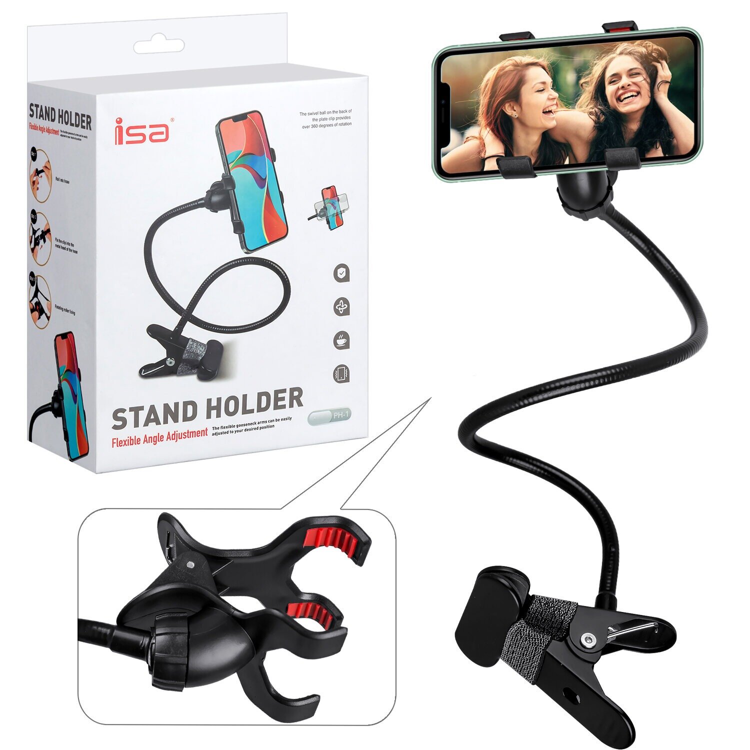 Универсальный гибкий держатель PH-1 ISA для телефона до 11 см, белый 55 см / Подставка для смартфона, шарнирное крепление, силиконовое покрытие, вращение на 360 / Крепление с прищепкой