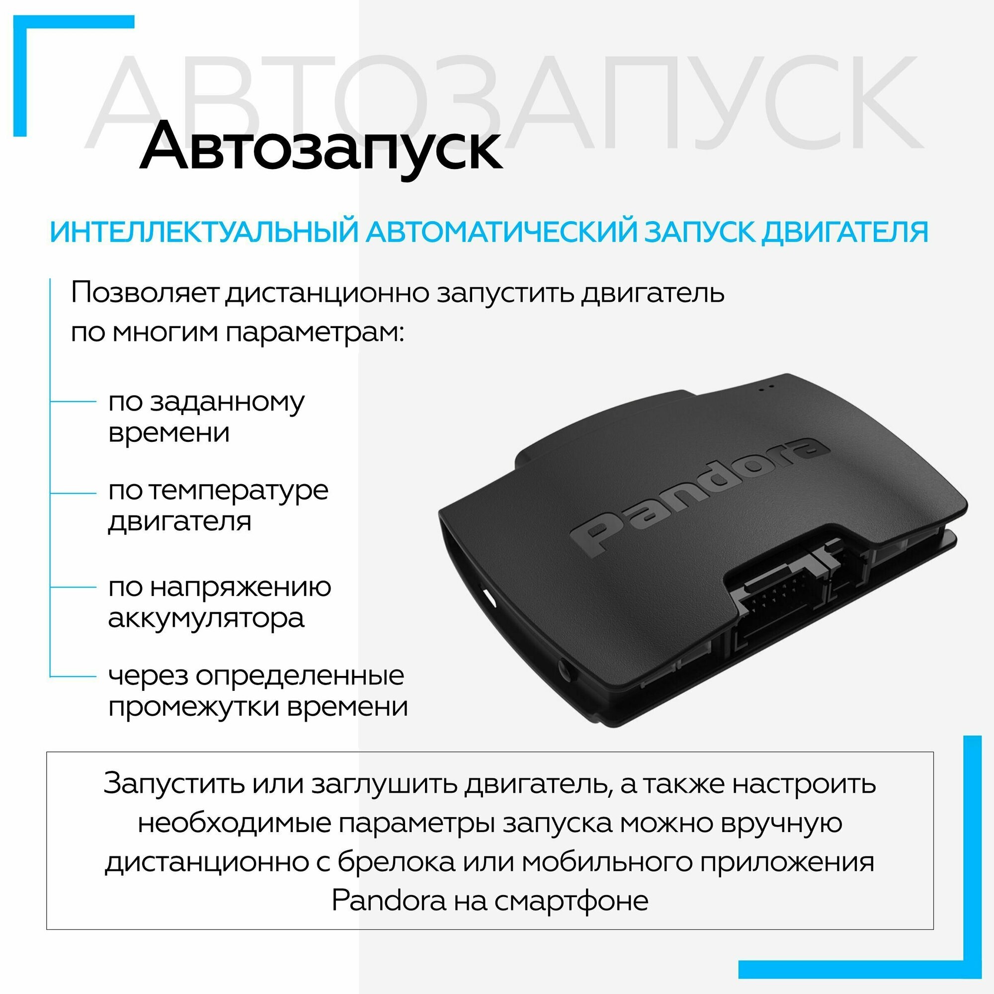 | Автозапуск двигателя | по дням недели / по заданному времени / по температуре / при низком заряде АКБ / через заданные интервалы |