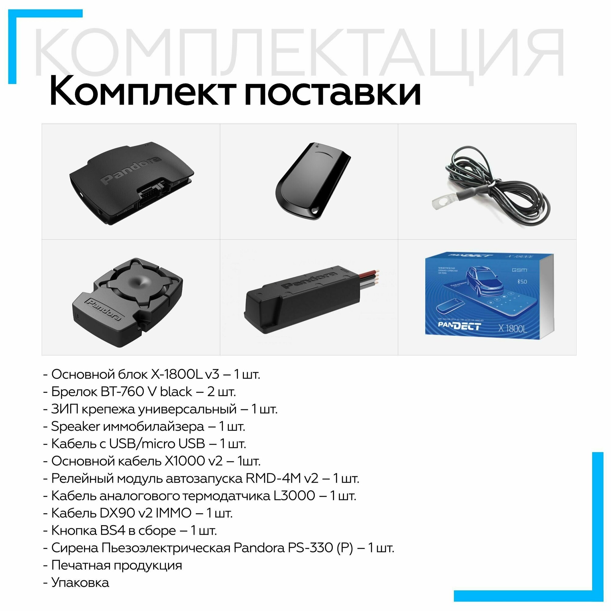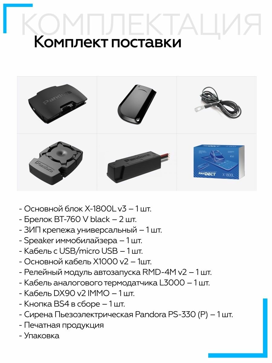 | Подробная комплектация | 1. Руководство по эксплуатации и монтажу 1 шт. 2. Индивидуальная карта владельца 1 шт. 3. Радиометка BT-760 2 шт. 4. Чехол для радиометки 1 шт. 5. Выносная кнопка 1 шт. 6. Бипер (малогабаритный звуковой извещатель) 1 шт. 7. Базовый блок системы 1 шт. 8. Внешний датчик температуры 1 шт. 9. Пьезоэлектрическая сирена PS-330 1 шт. 10. Основной кабель базового блока 1 шт. 11. Кабель многофункционального интерфейса IMMO-KEY 1 шт. 12. Комплект крепежа 1 шт. 13. Упаковка 1 шт. |