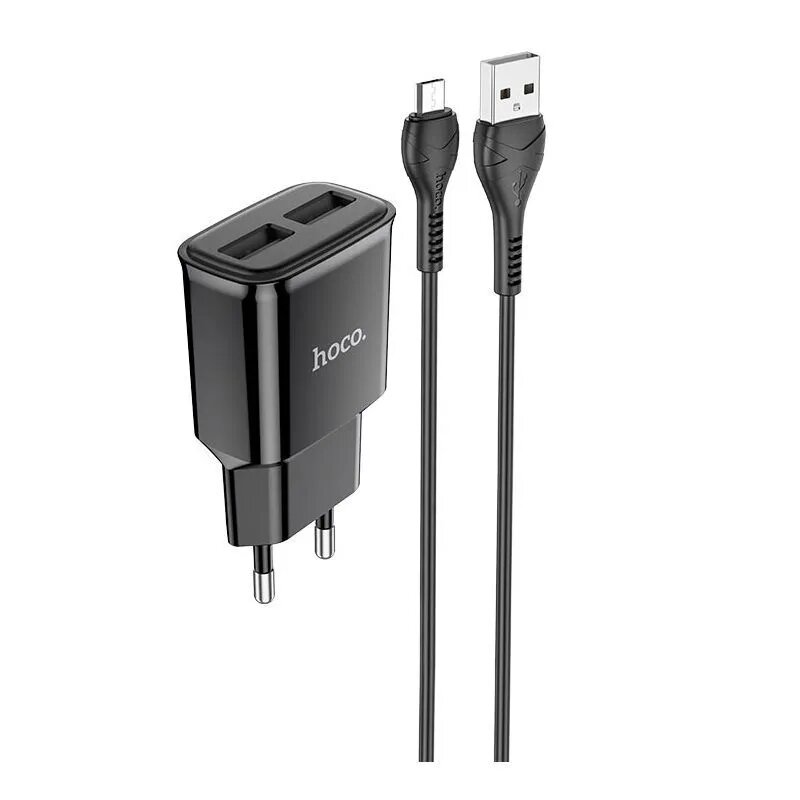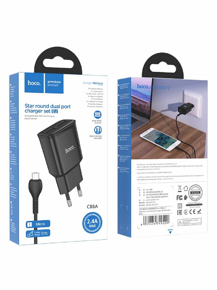 Сетевое зарядное устройство, 2 USB 2.4A (C88A), HOCO, Micro, черный