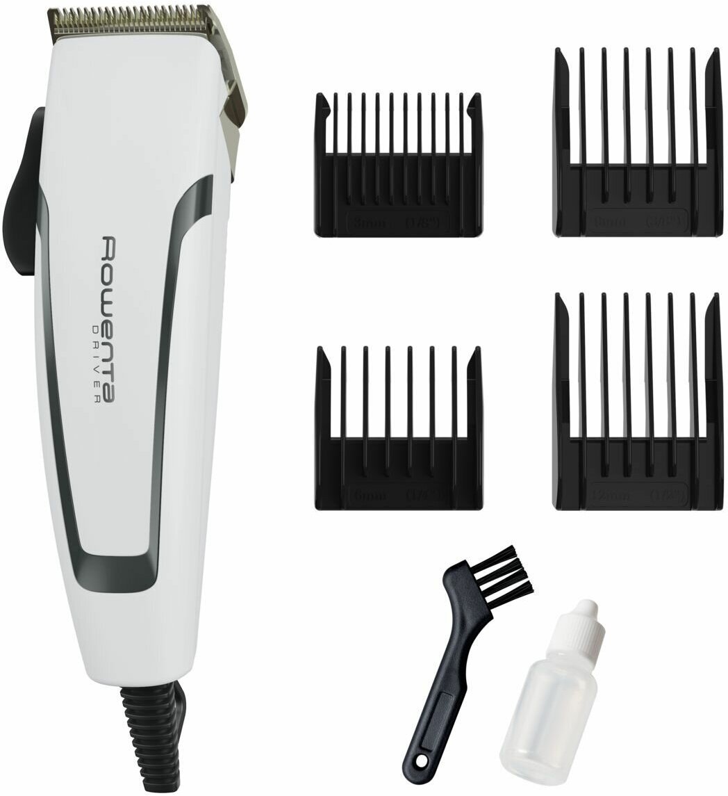 Машинка для стрижки волос Rowenta Pure Collection Driver TN1605F0 белый/черный, работа от сети, 1-12 мм, лезвие из нержавеющей стали, 1 скорость