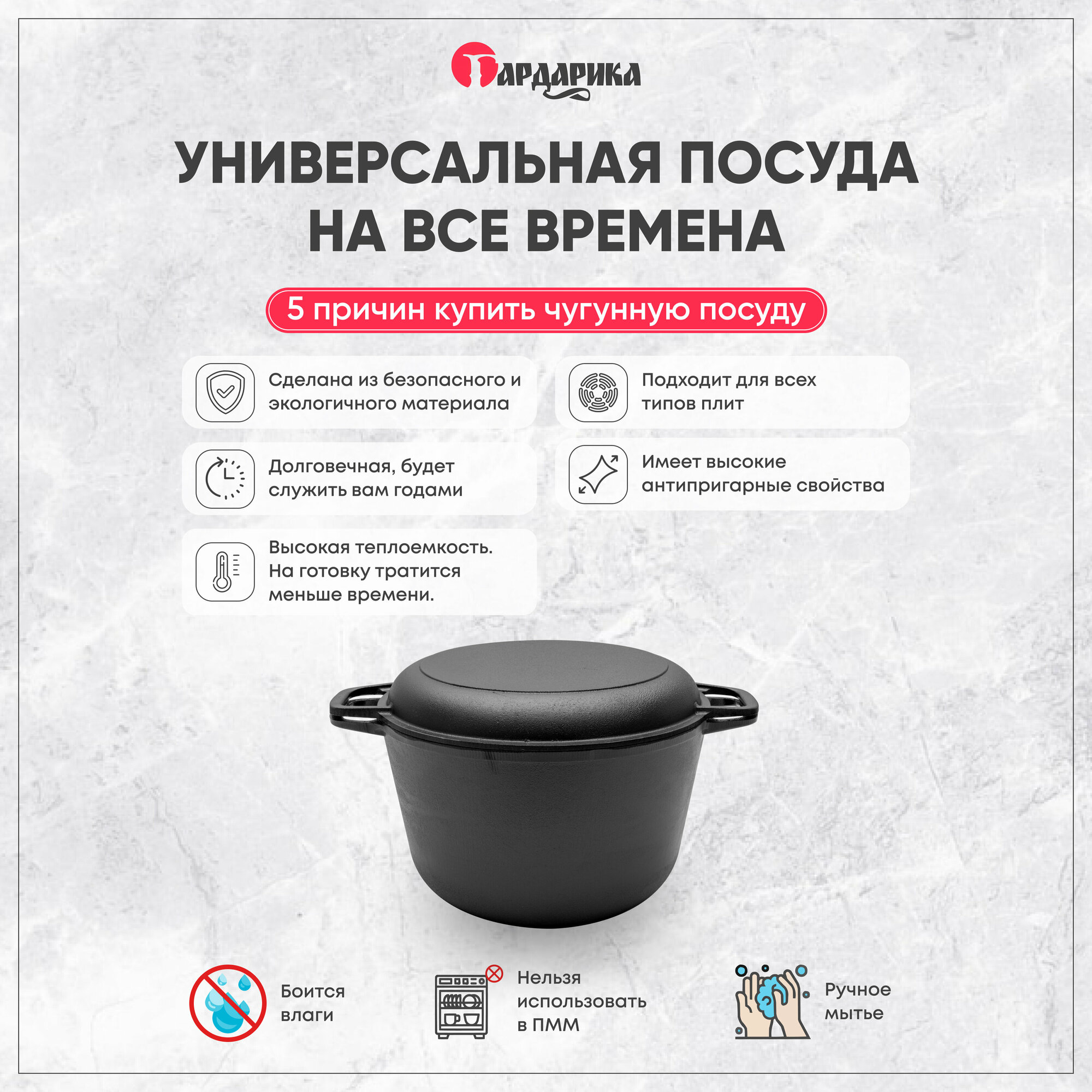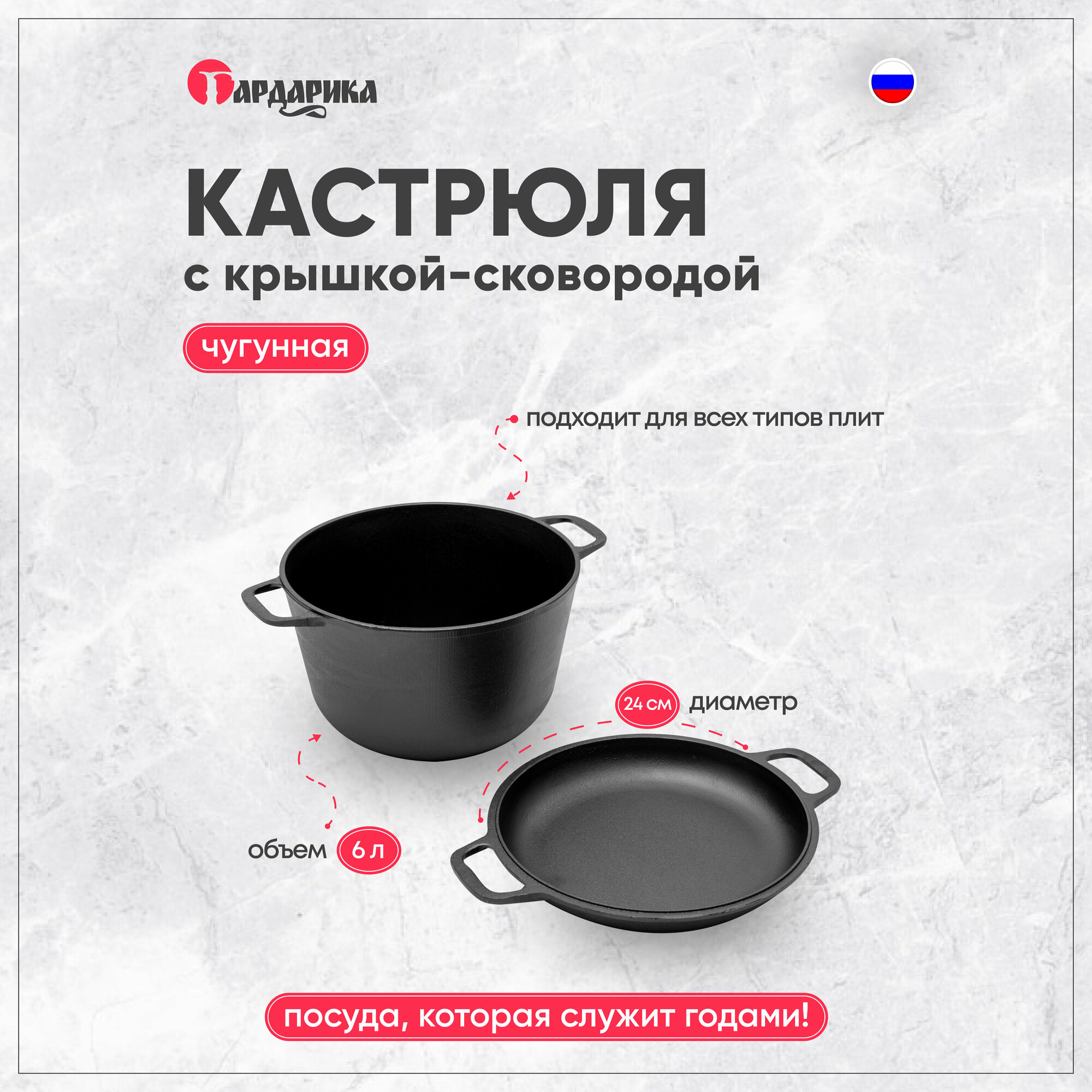 | Дополнительная информация | Кастрюля Гардарика чугунная с крышкой-сковородой |