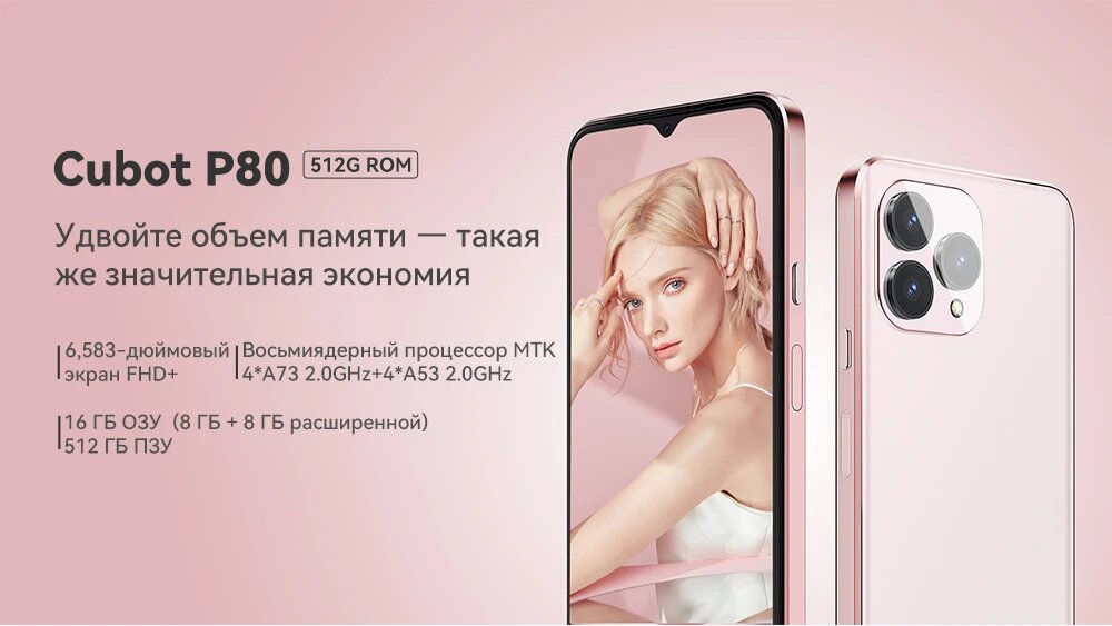 Смартфон CUBOT P80, 2 SIM, 16/512 Gb, NFC, светло-розовый