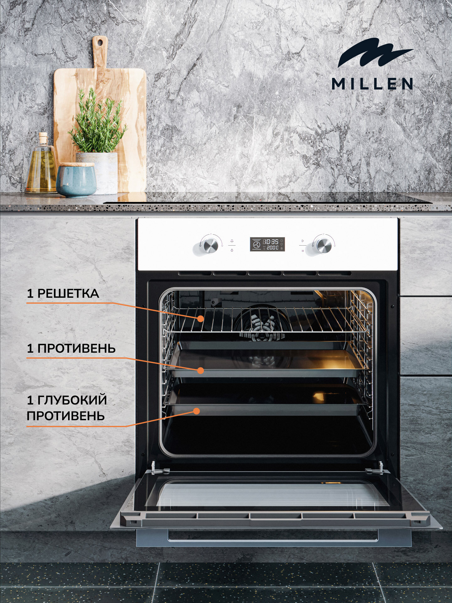 Духовой шкаф встраиваемый, электрический MILLEN MEO 602 WH, белый, Таймер, Отделка Стекло, Объем 70 л,1 глубокий противень, 1 противень, 1 решетка, Размер для встраивания 600х560х570 мм, количество режимов 10