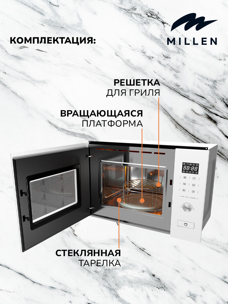 Купить Микроволновая печь встраиваемая, MILLEN MBW 381 WH, белый, Блокировка управления, Дисплей, Звуковой сигнал, Разморозка по весу/времени, Таймер,Решётка для гриля,Мощность гриля 1000 Вт