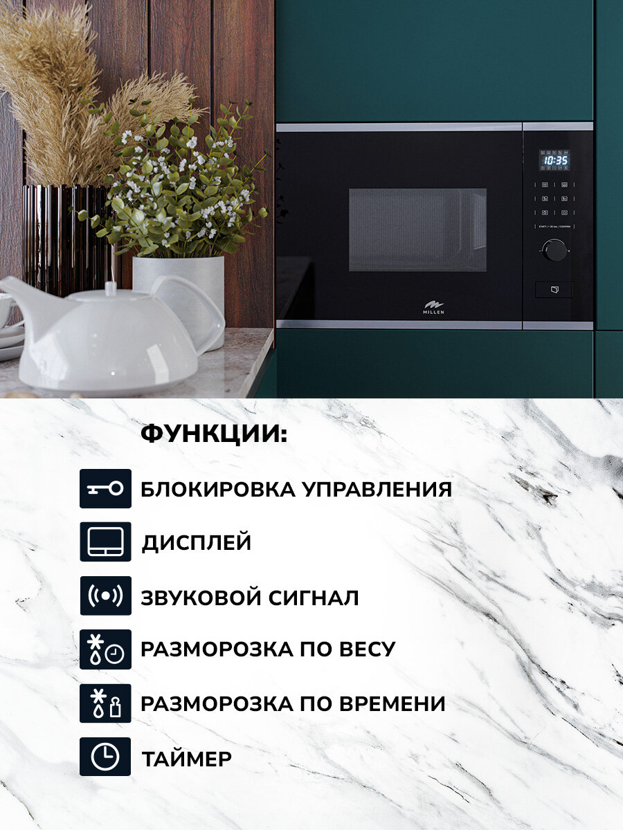 Микроволновая печь встраиваемая, MILLEN MBW 381 BL, Объем 20 л, Мощность гриля 1000 Вт, Разморозка по весу/времени, таймер, Решётка для гриля