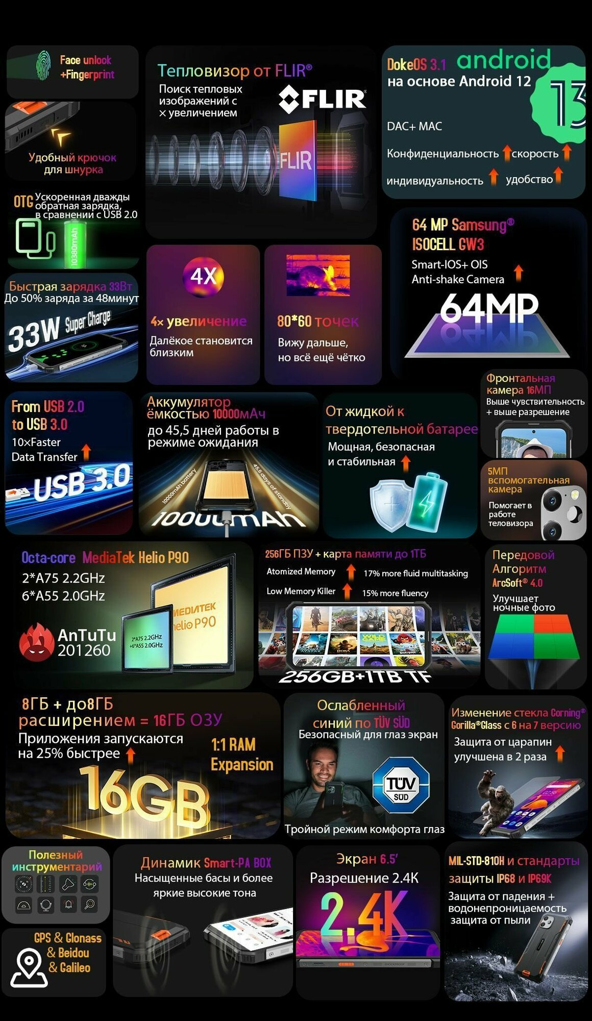 Blackview BV8900 Thermal от FLIR ® Прочный телефон, 16 ГБ, 256 ГБ, Android 13, 6,5-дюймовый дисплей Helio P90, 64 МП, камера, 10000 мАч, NFC-мобильный телефон, Orange, 16 Гб, 256 ГБ, Глобальная версия