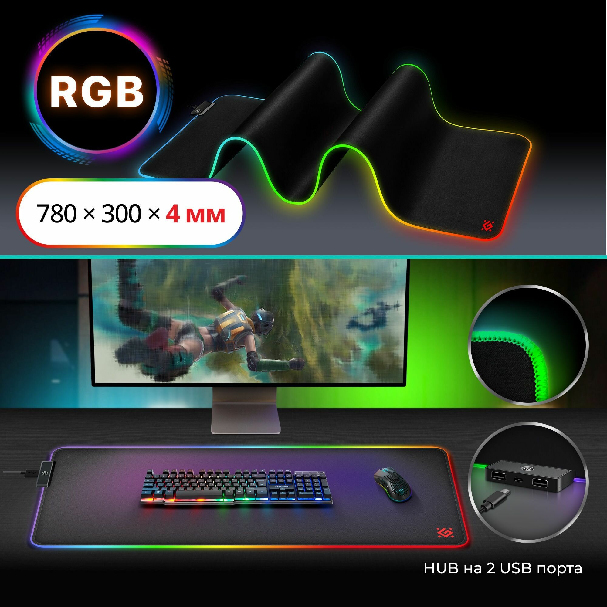 Коврик игровой Defender Black XXL HUB Light 780*300*4 мм, RGB подсветка