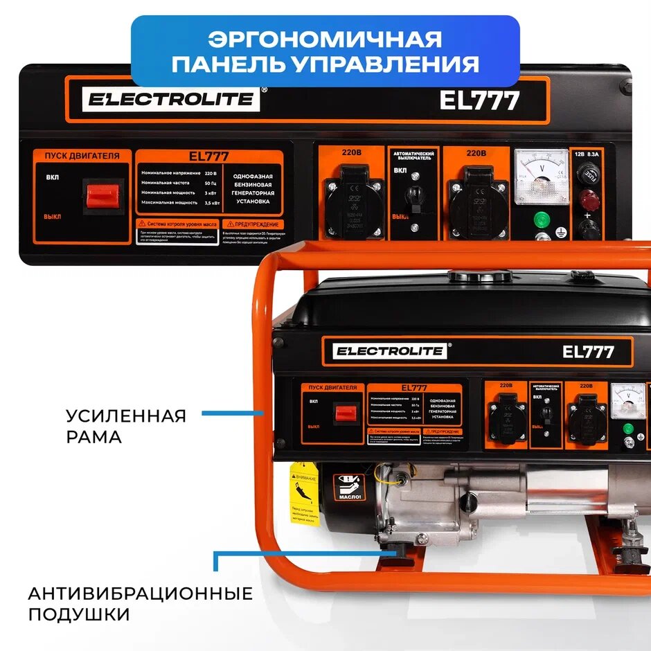 Бензиновый генератор Electrolite 777 EL ( 4.875 кВа максимальная нагрузка , 220 В, 3 / 3.5 кВт, 7 л. с, ручной стартер )