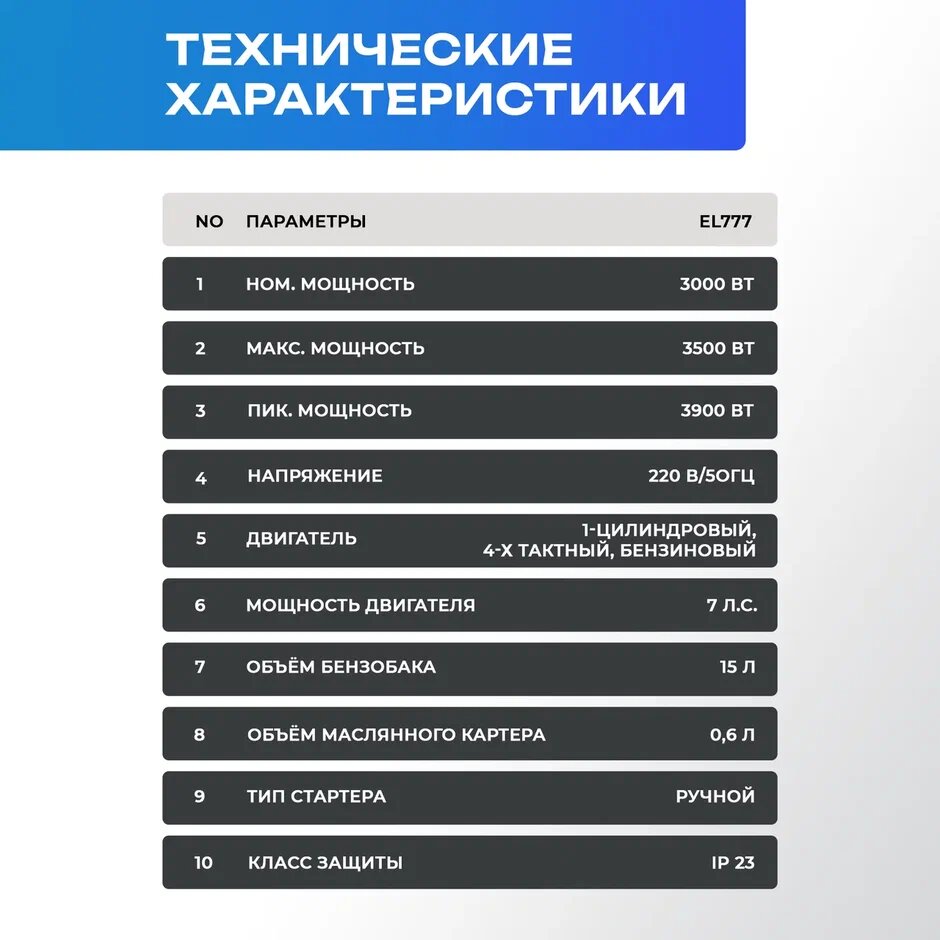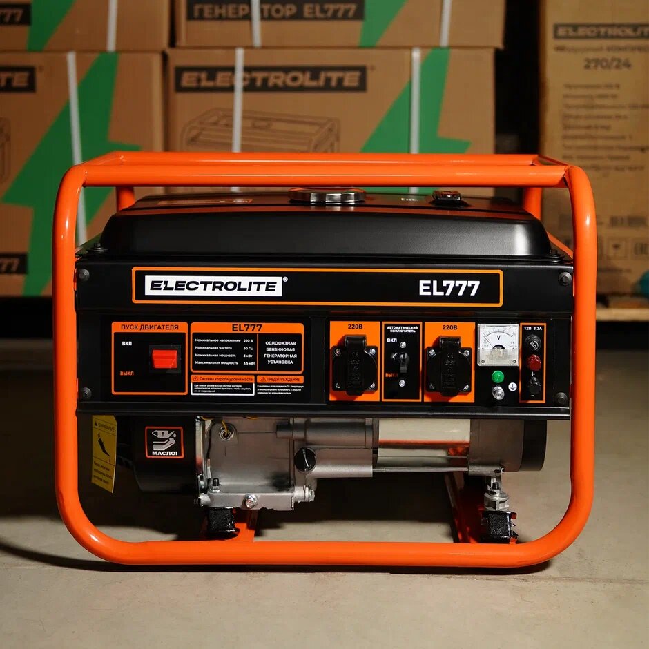 Генератор бензиновый Электрический Electrolite EL777 ( 4.875 кВа максимальная нагрузка , 220 В, 3 / 3.5 кВт, 7 л.с, ручной стартер )