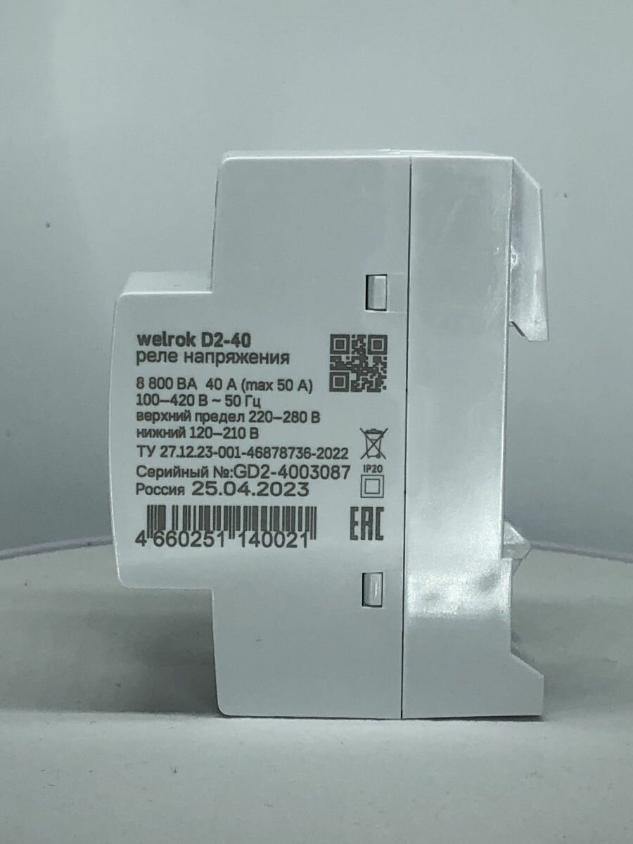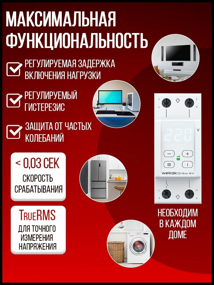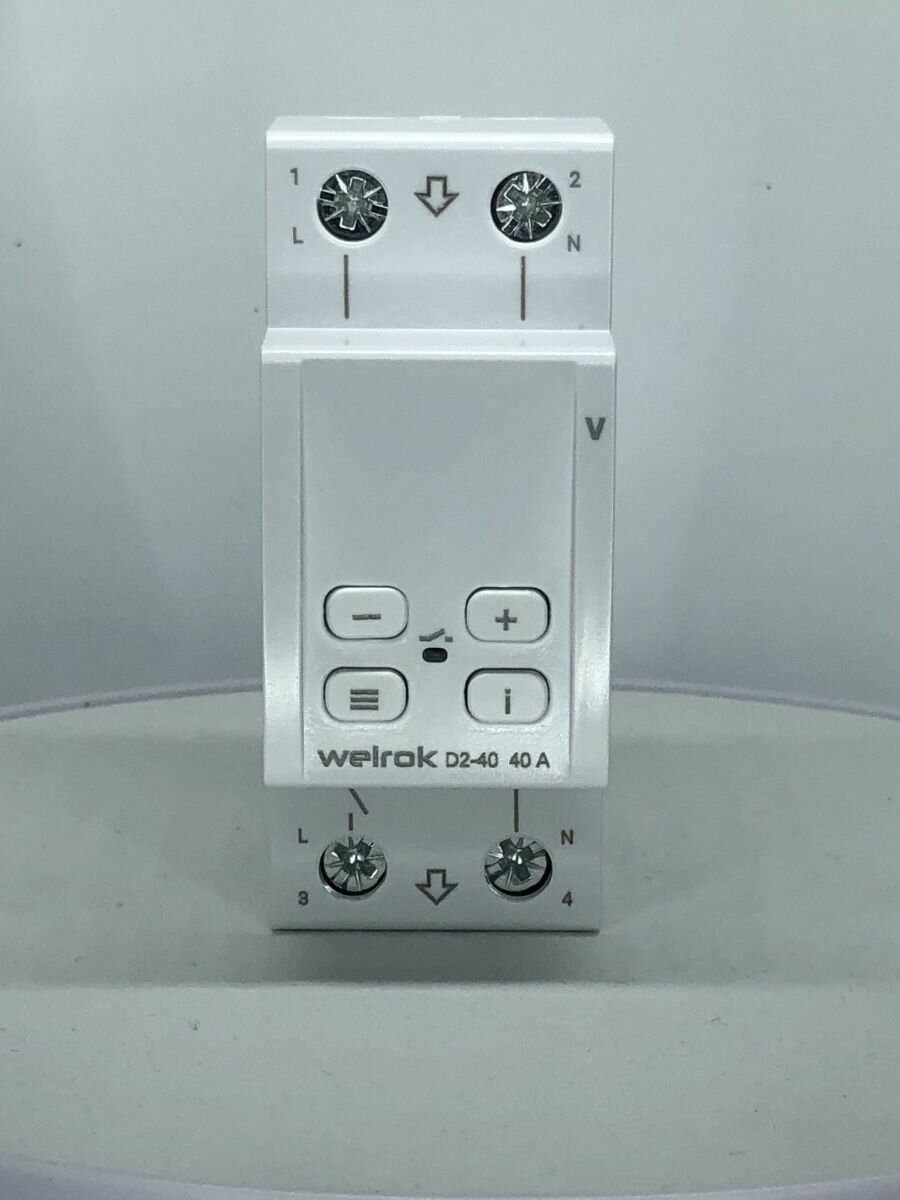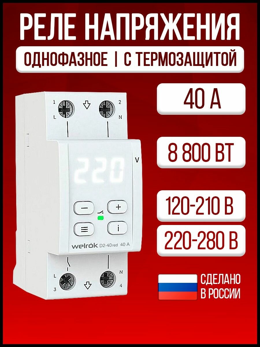 Реле контроля напряжения Welrok D2-40, однофазное, 40А, два модуля, термозащита, белая индикация