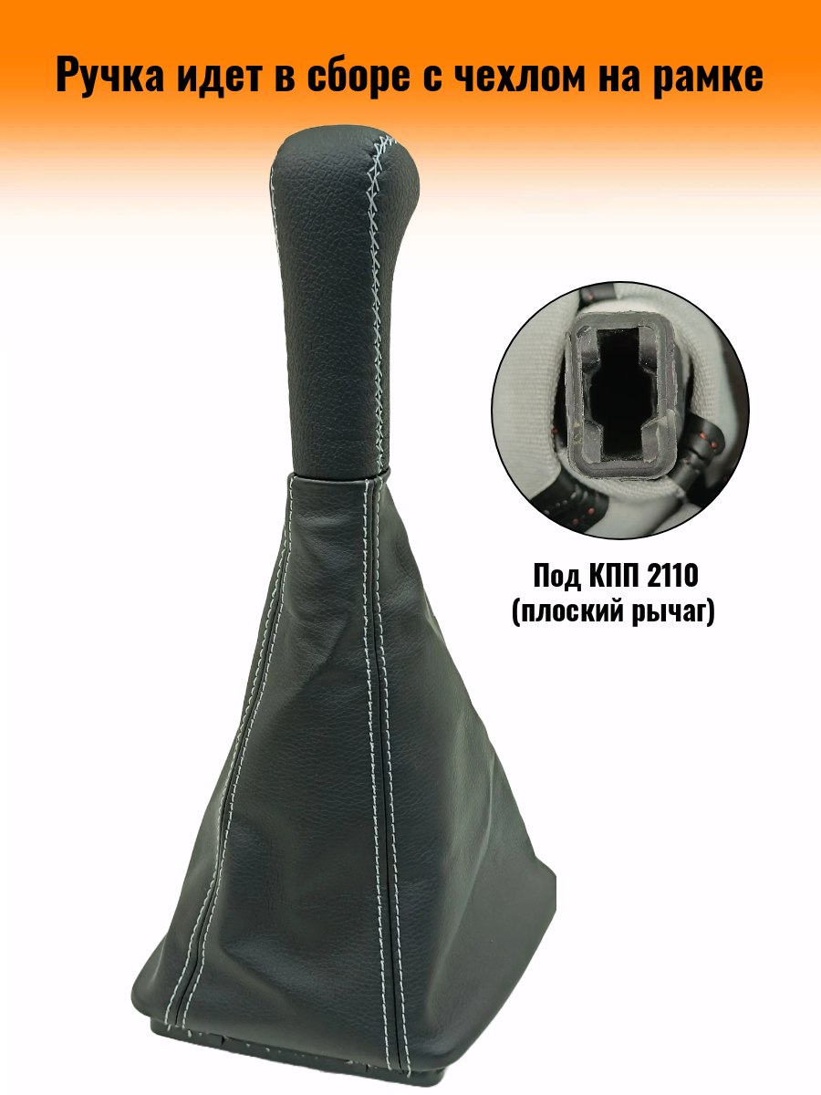 Ручка КПП на ВАЗ-2170, Лада Приора 1 (LADA Priora 1) c ВАЗ-2110 кулисой, ЛЮКС-черная вставка, черный с белой строчкой