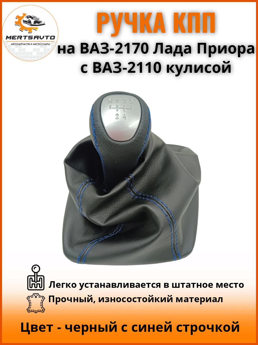 СохранитьРучка КПП на ВАЗ-2170, Лада Приора 1 (LADA Priora 1) c ВАЗ-2110 кулисой люкс-серебро, ручка коробки переключения передач, черный с синей строчкой интересное:
