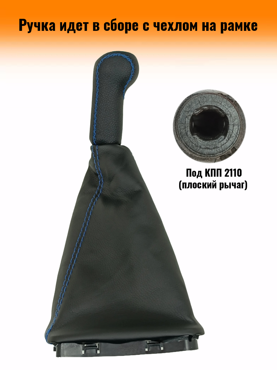 Ручка КПП на ВАЗ-2170, Лада Приора 1 (LADA Priora 1) c ВАЗ-2110 кулисой, ЛЮКС-черная вставка, черный с синей строчкой