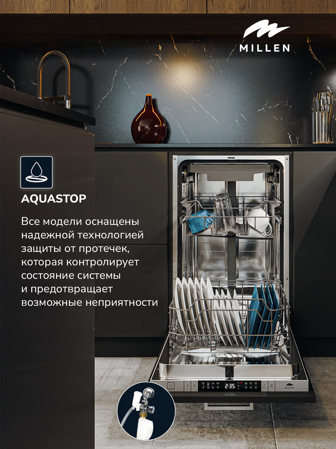 Встраиваемая посудомоечная машина MILLEN MDW 451, Управление Электронное, ширина 45 см, 3 лотка, 10 комплектов, Express, Интенсивная мойка, Экстрасушка, Энергосберегающая мойка, Отложенный старт 24ч, AquaStop