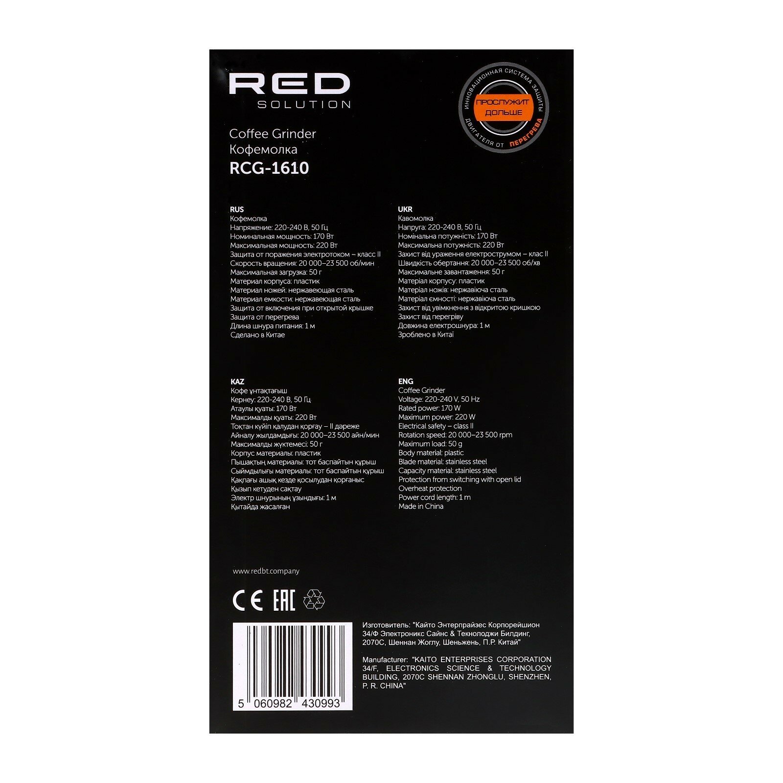 Купить Кофемолка RED Solution RCG-1610, ножевая, 220 Вт, 50 г, чёрная