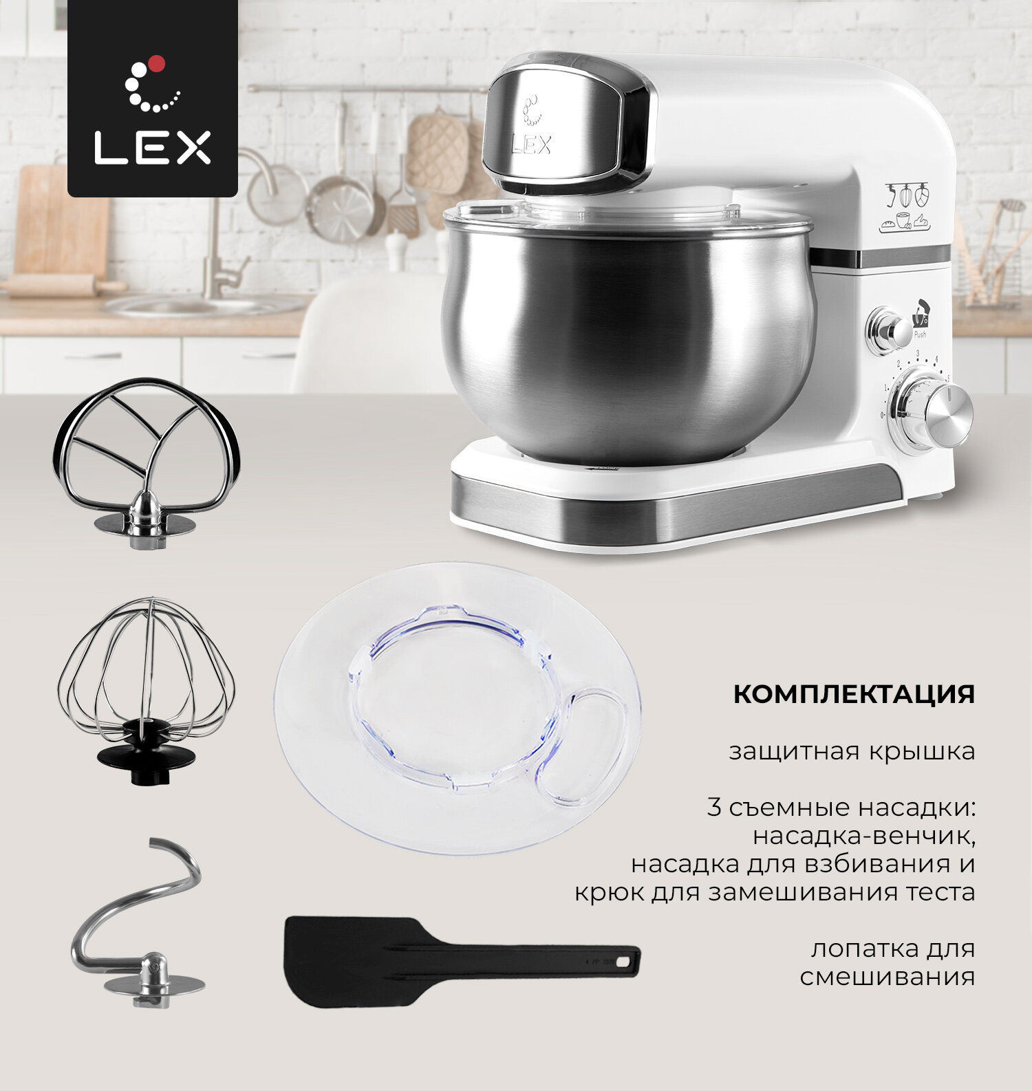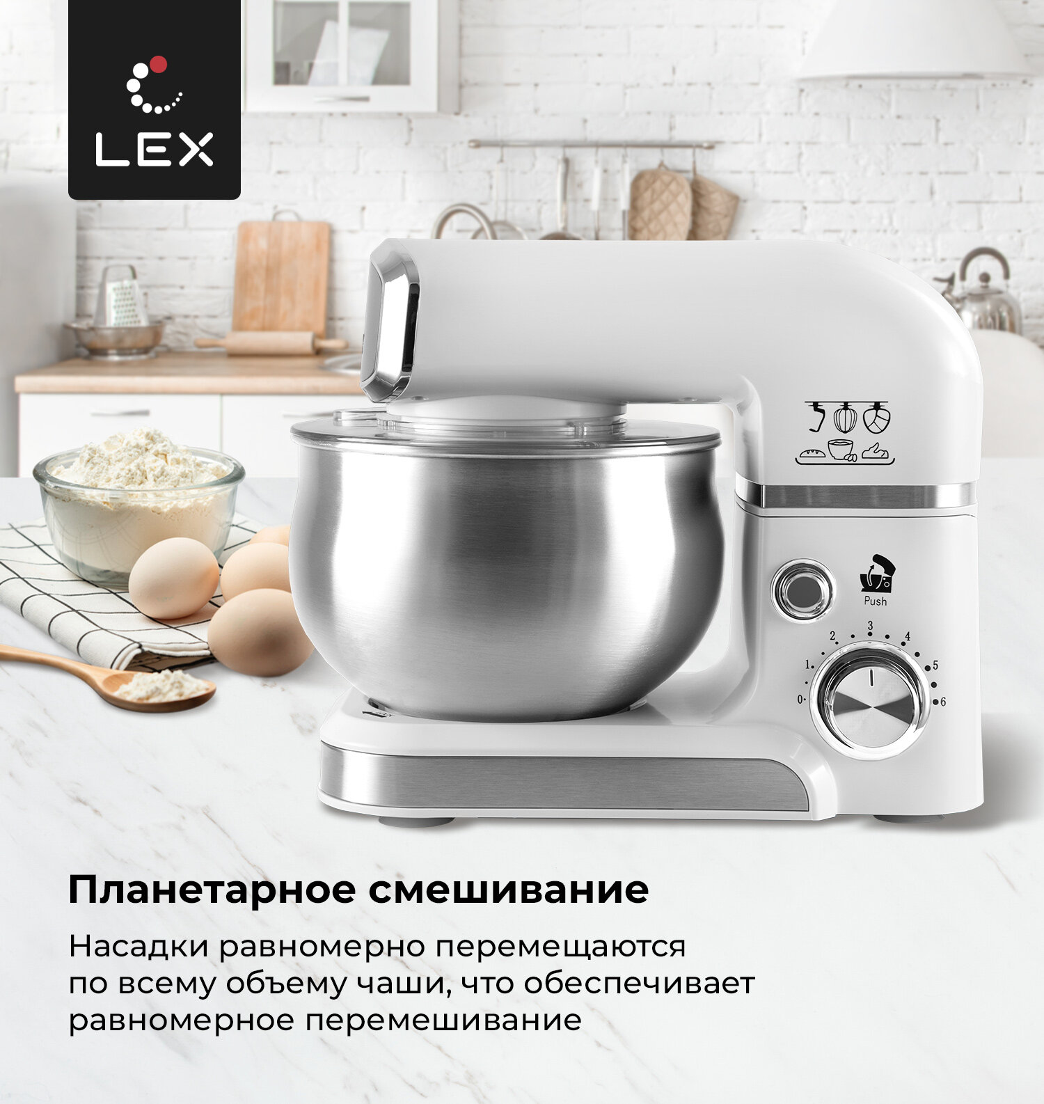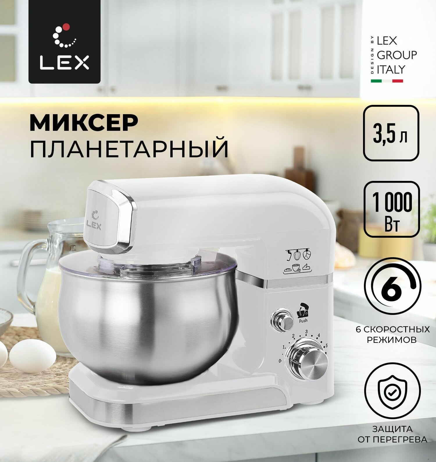 Миксер планетарный LEX LXMX 4133, Защита от перегрева, Защита от перегрузки, Прорезиненные нескользящие ножки, Объем чаши-3,5л.