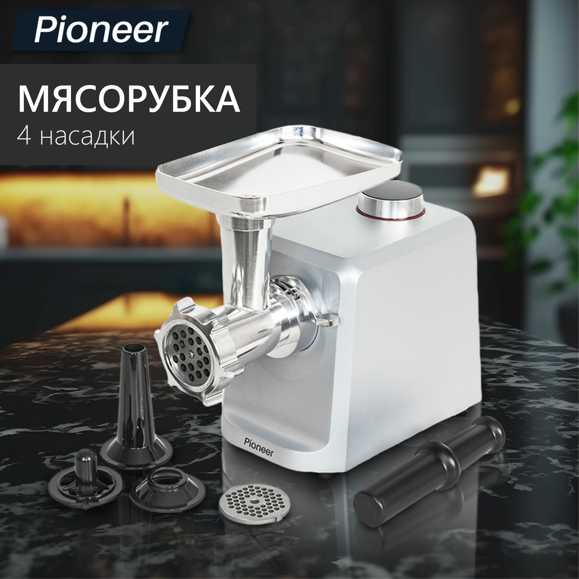 Мясорубка Pioneer с реверсом, 4 скорости, насадки для колбасок и кеббе, 2 решетки 5 мм и 8 мм, 2500 Вт
