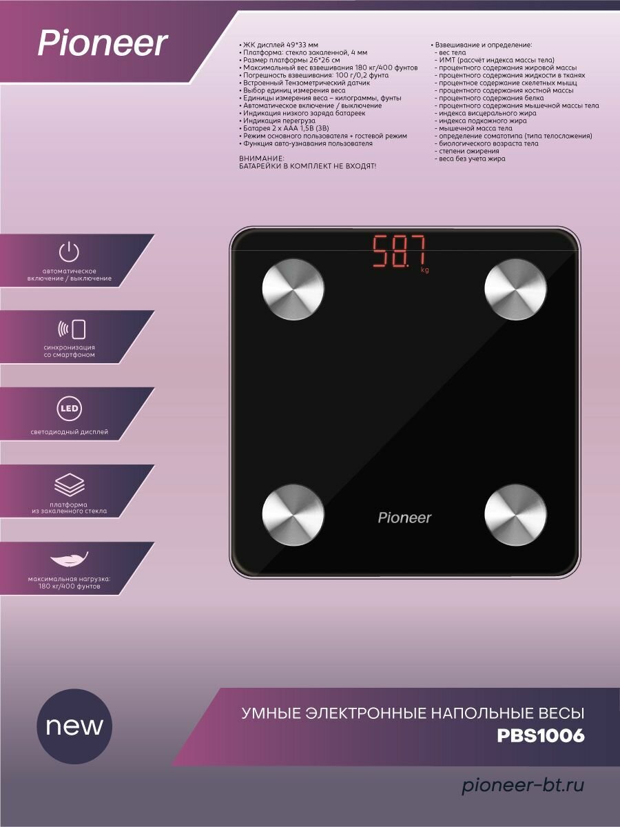 Умные напольные весы Pioneer PBS1006, тензометрический датчик, LED-дисплей, измерение жира/воды/мышечной массы, смартфон-управление, Bluetooth, до 180 кг