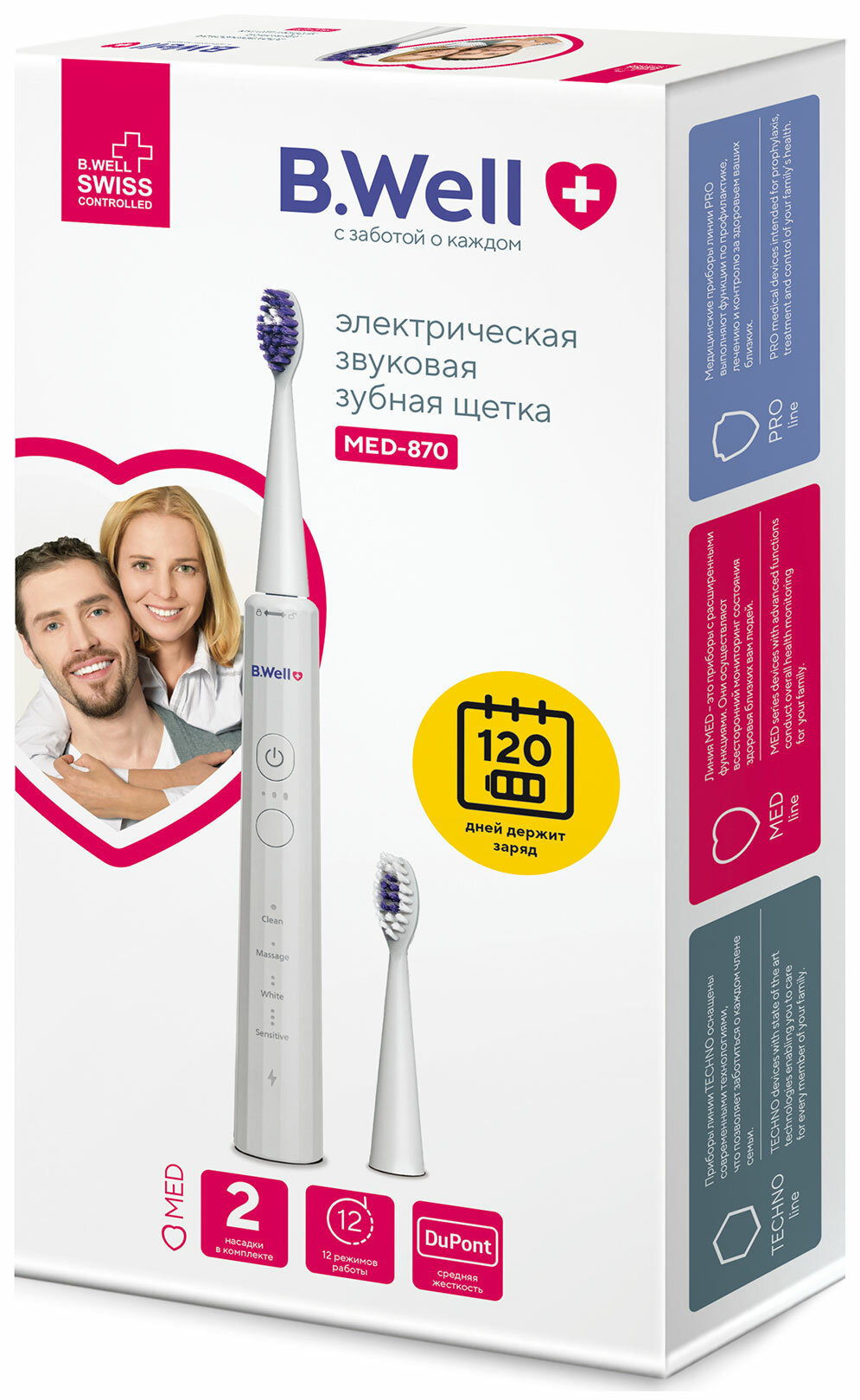 Электрическая зубная щетка B.Well MED-870 звуковая белая, 12 режимов, 120 дней без подзарядки