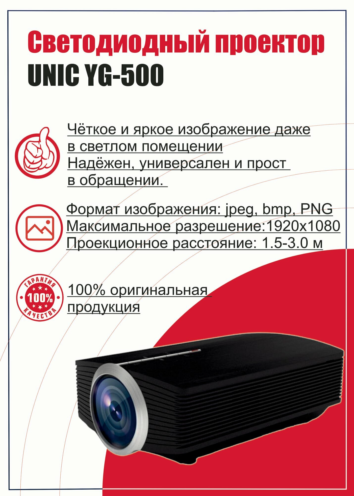 | Дополнительная информация | в комплекте светодиодный проектор UNIC YG-500, пульт дистанционного управления, инструкция на английском языке, кабель 3,5 (мини-джек)*3RCA (колокольчики), шнур 220В на европейскую розетку |