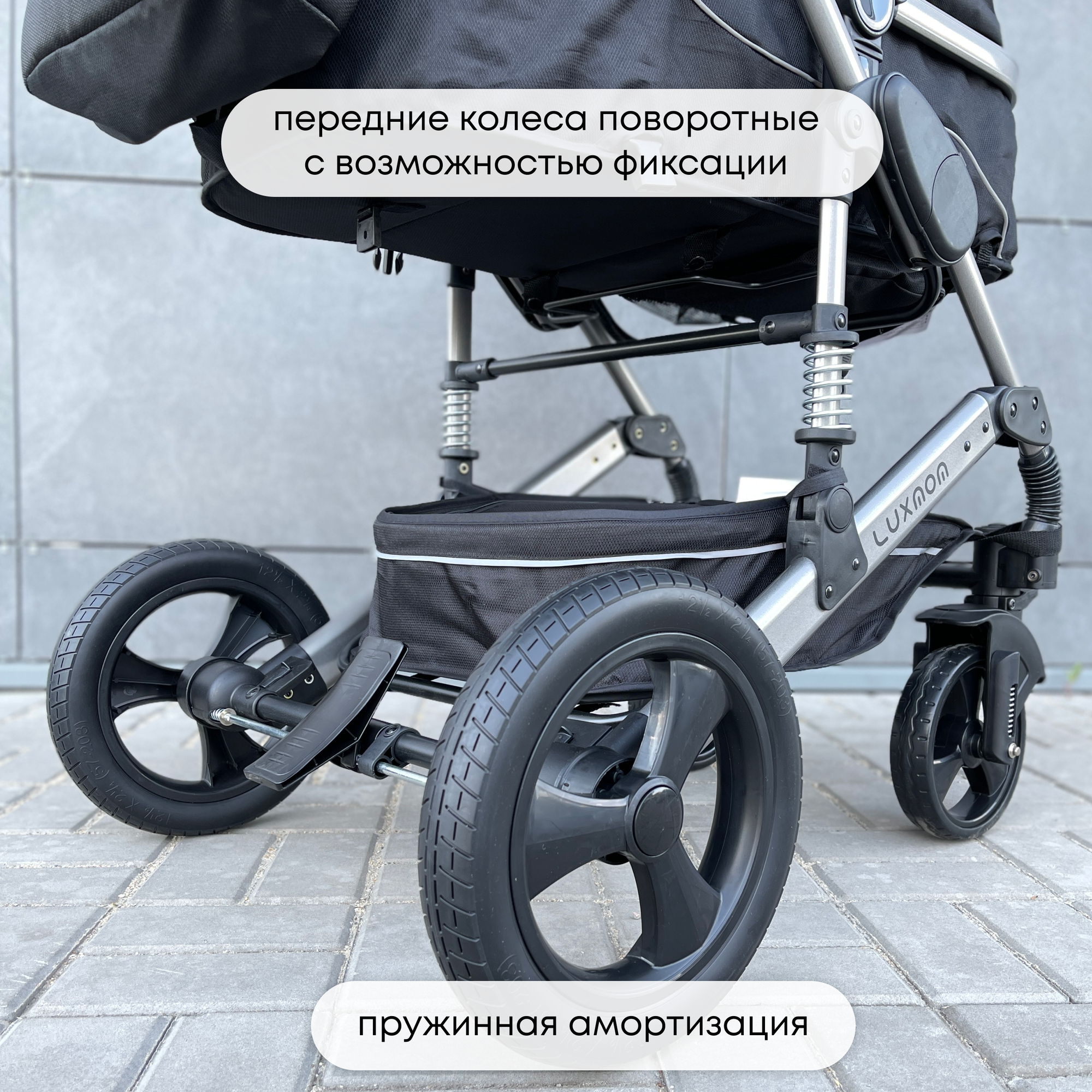 | Особенности шасси | корзина для покупок / перестановка блока лицом/спиной / регулировка высоты ручки / съемные колеса |