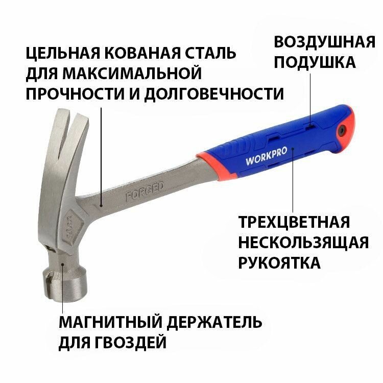 Молоток кованый с гвоздодёром и магн. держателем WP241014, WORKPRO #WP241014