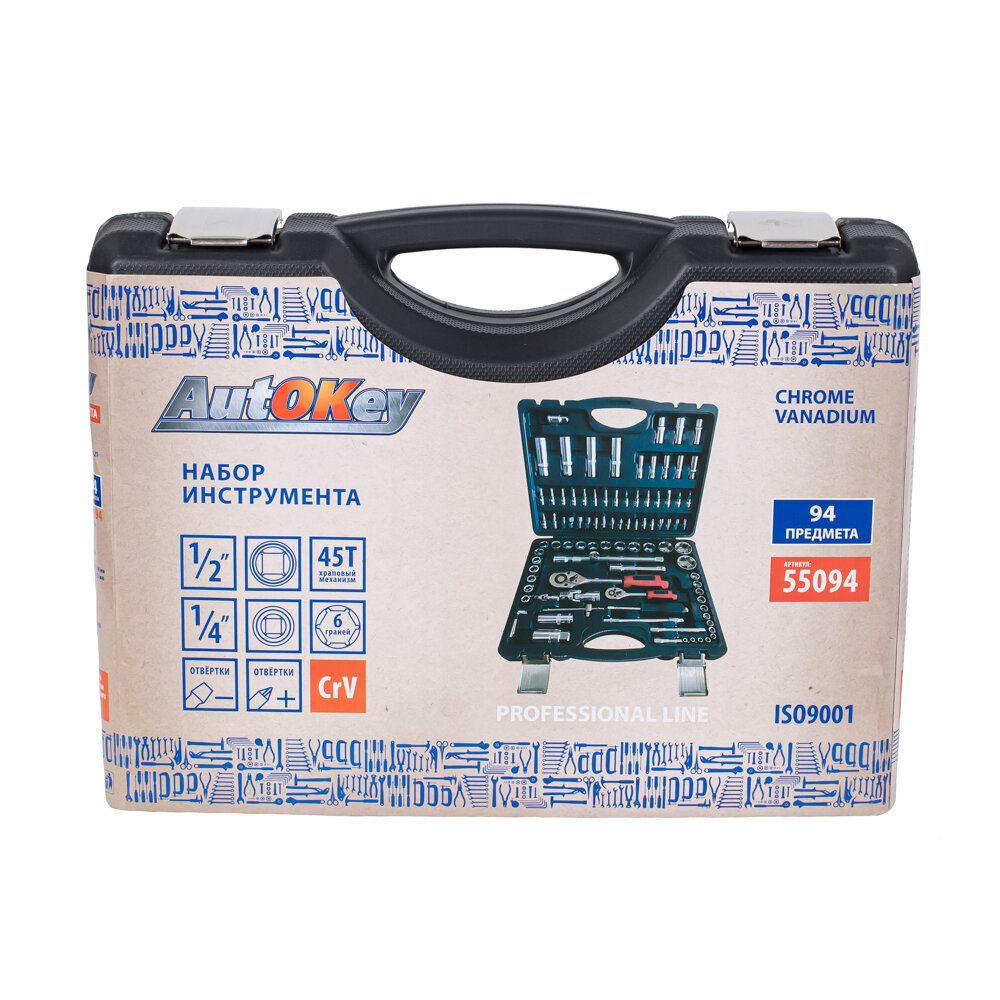 Набор инструментов 94 предмета AutOKey 1/2" и 1/4" (головки торцевые, биты, трещетки), 55094 интересное: