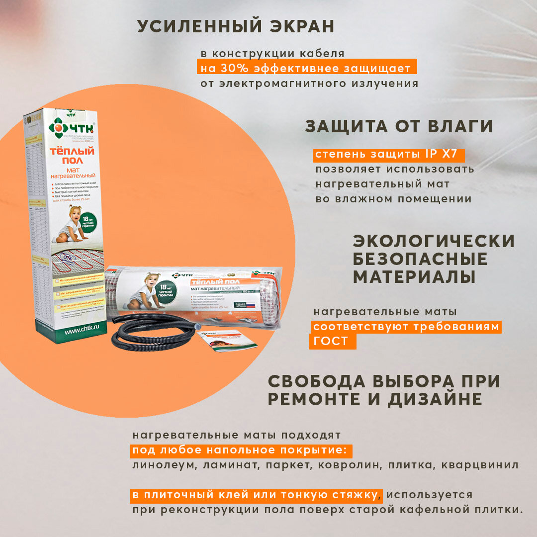 Нагревательный мат теплый пол в стяжку/плитку "ЧТК" МНД 150-450, площадь 3,0 м.кв., мощность 450 Вт, в подарок Механический терморегулятор!