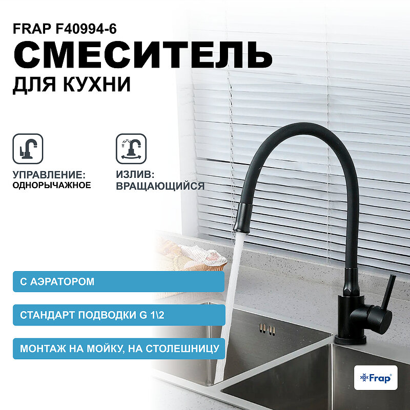 Смеситель для кухни с гибким, поворотным изливом Frap F40994-6 черный интересное: