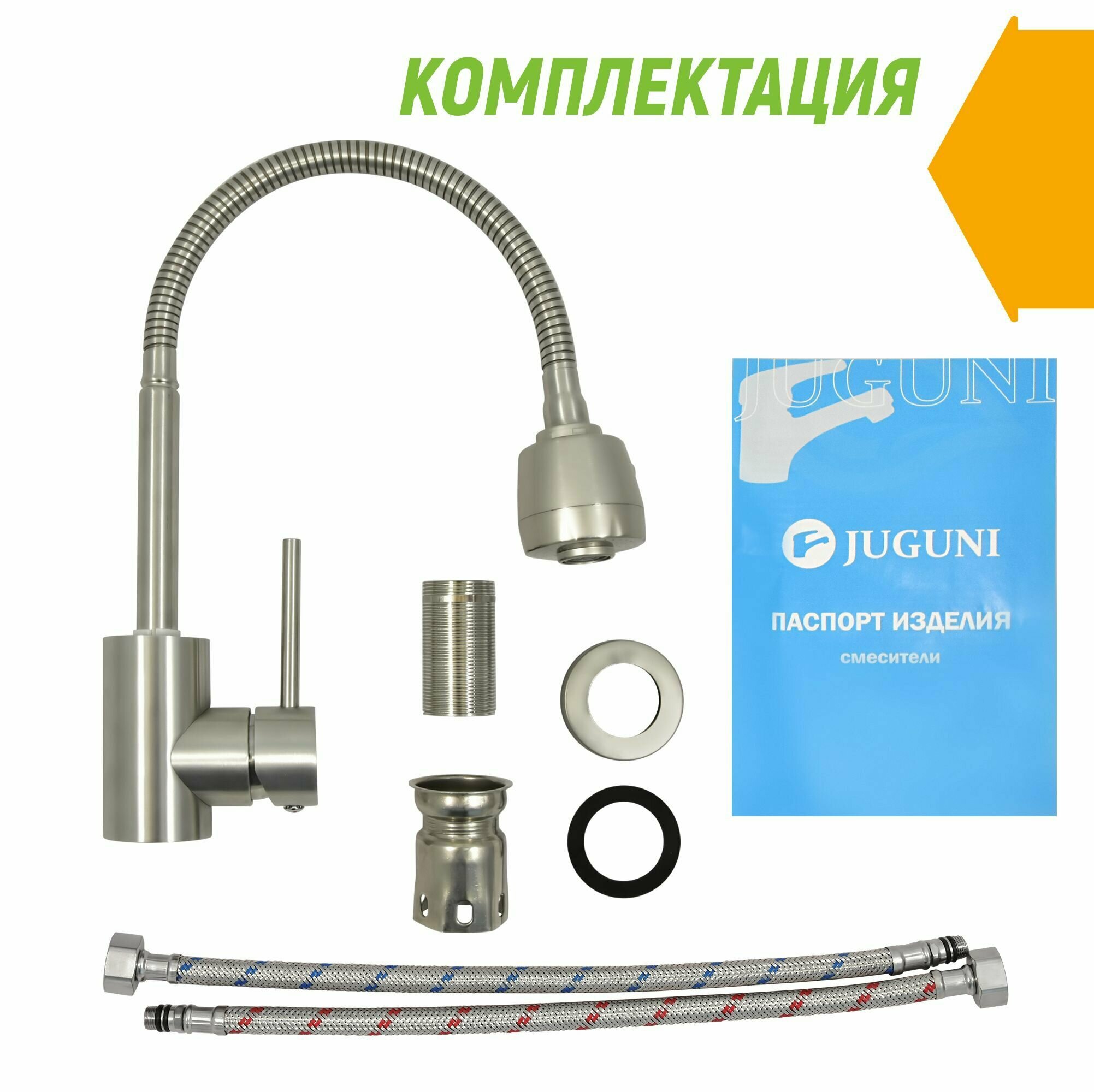 Смеситель для мойки с гибким изливом 2 режима (обычный / душ), нерж. сталь AISI304, Juguni, Арт: 0402.167