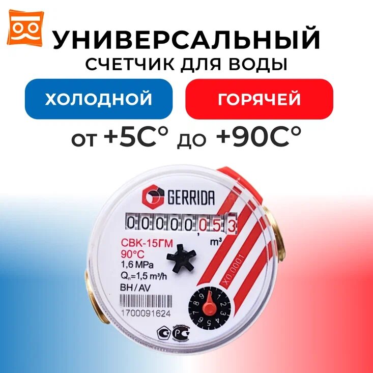 Счетчик воды Универсальный Геррида СВК-15Г, длинна 80 мм с монтажным комплектом / Gerrida, Поверка Не старше 35 дней (комплект 2шт.) интересное: