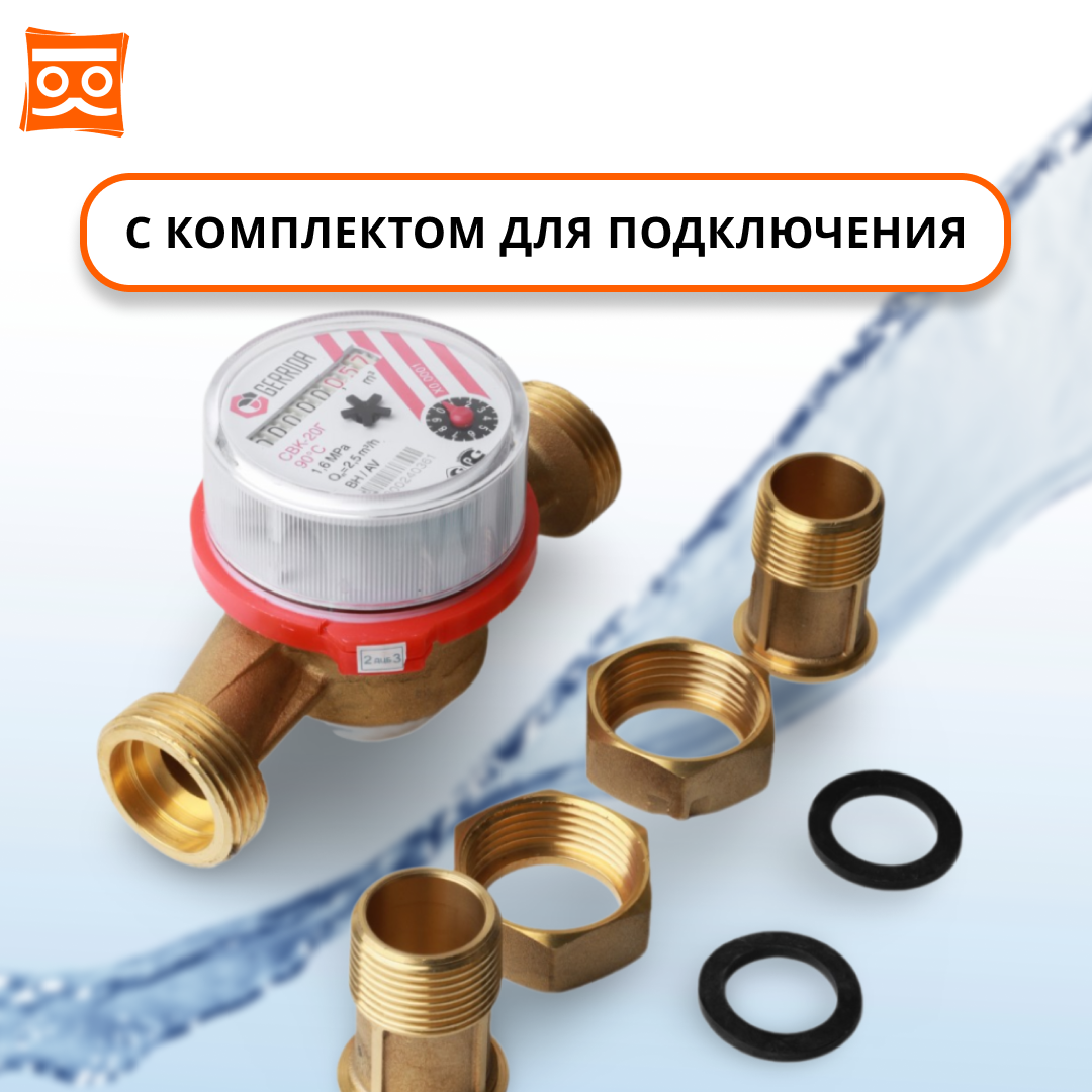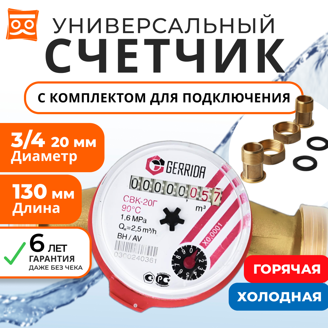 Счетчик для воды универсальный крыльчатый Gerrida СВК-20Г 3/4", 130 мм, с монтажным комплектом / Поверка Не старше 35 дней