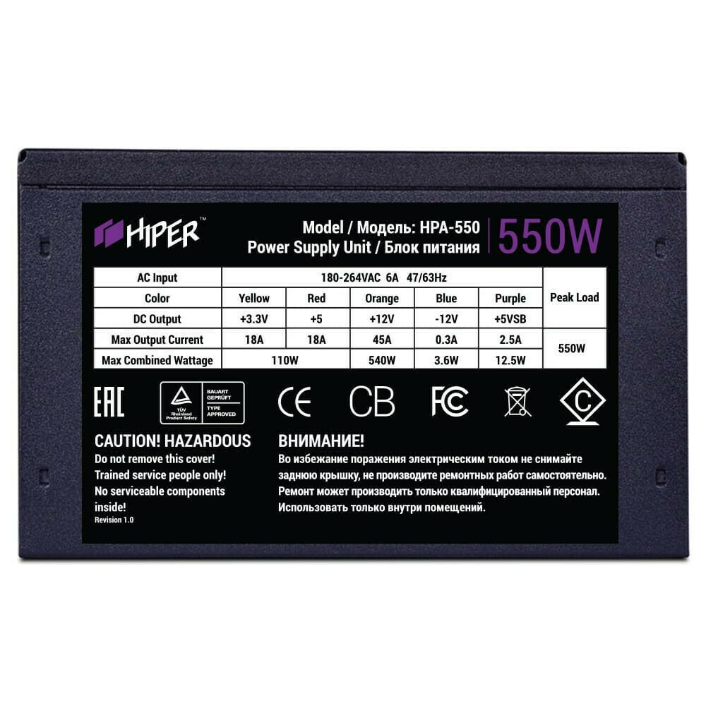 Блок питания HIPER Блок питания 550Вт Hiper HPA-550 ATX12V V2.31 (20/24+4/8+6/8pin, вентилятор d120мм) + кабель питания (ret)