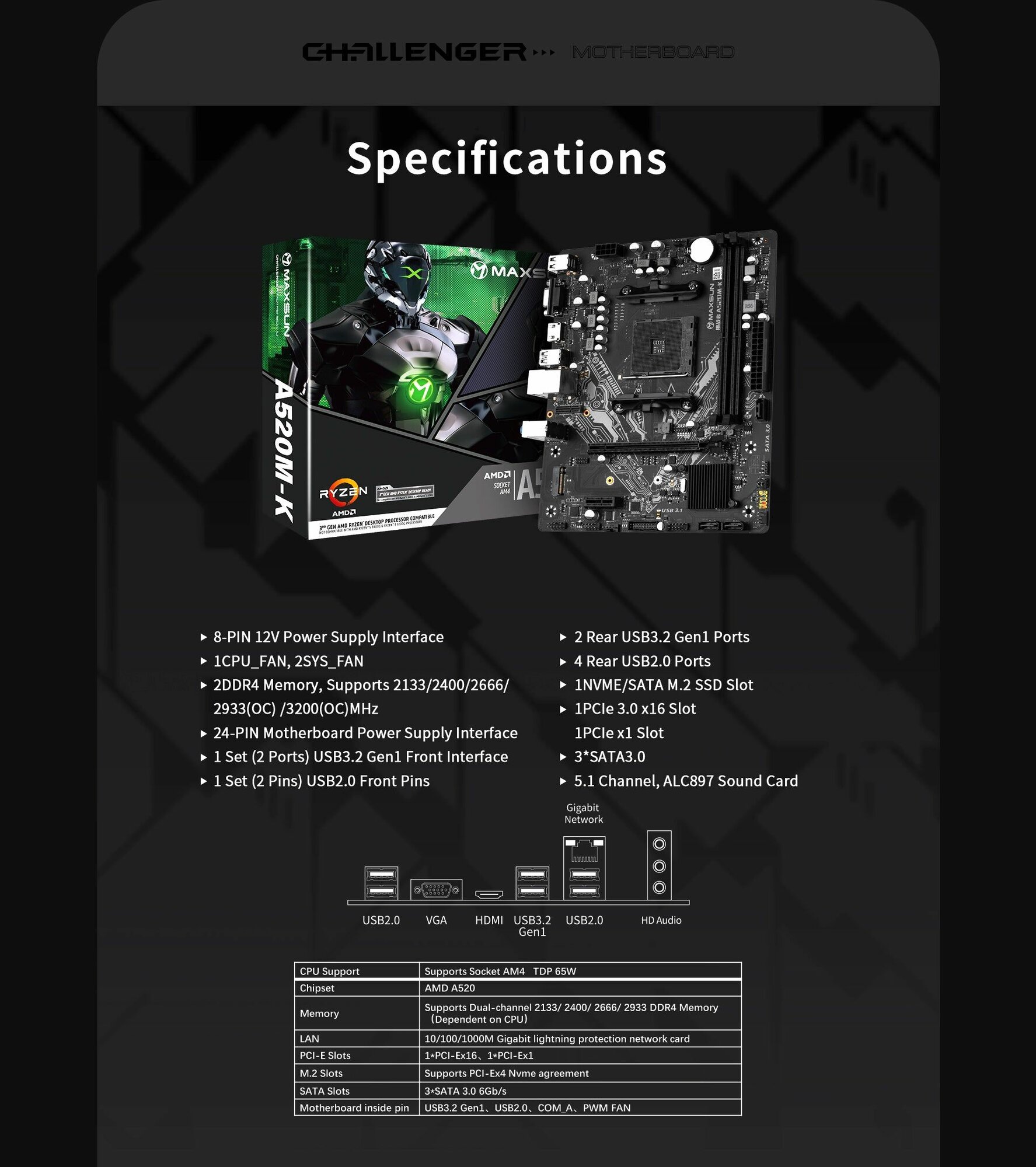 Материнская плата Maxsun CHALLENGER A520M-K (AM4, MATX)