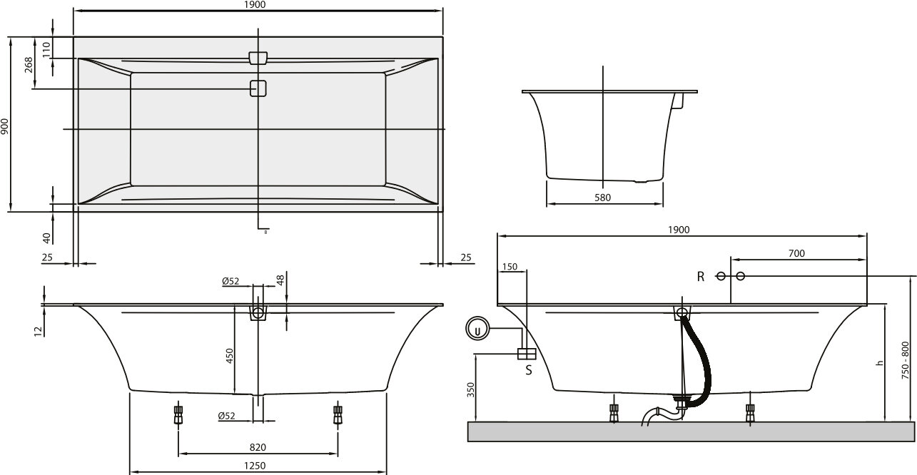 Ванна, Villeroy&Boch, Squaro Edge 12, шгв 1900*900*450, цвет-белый